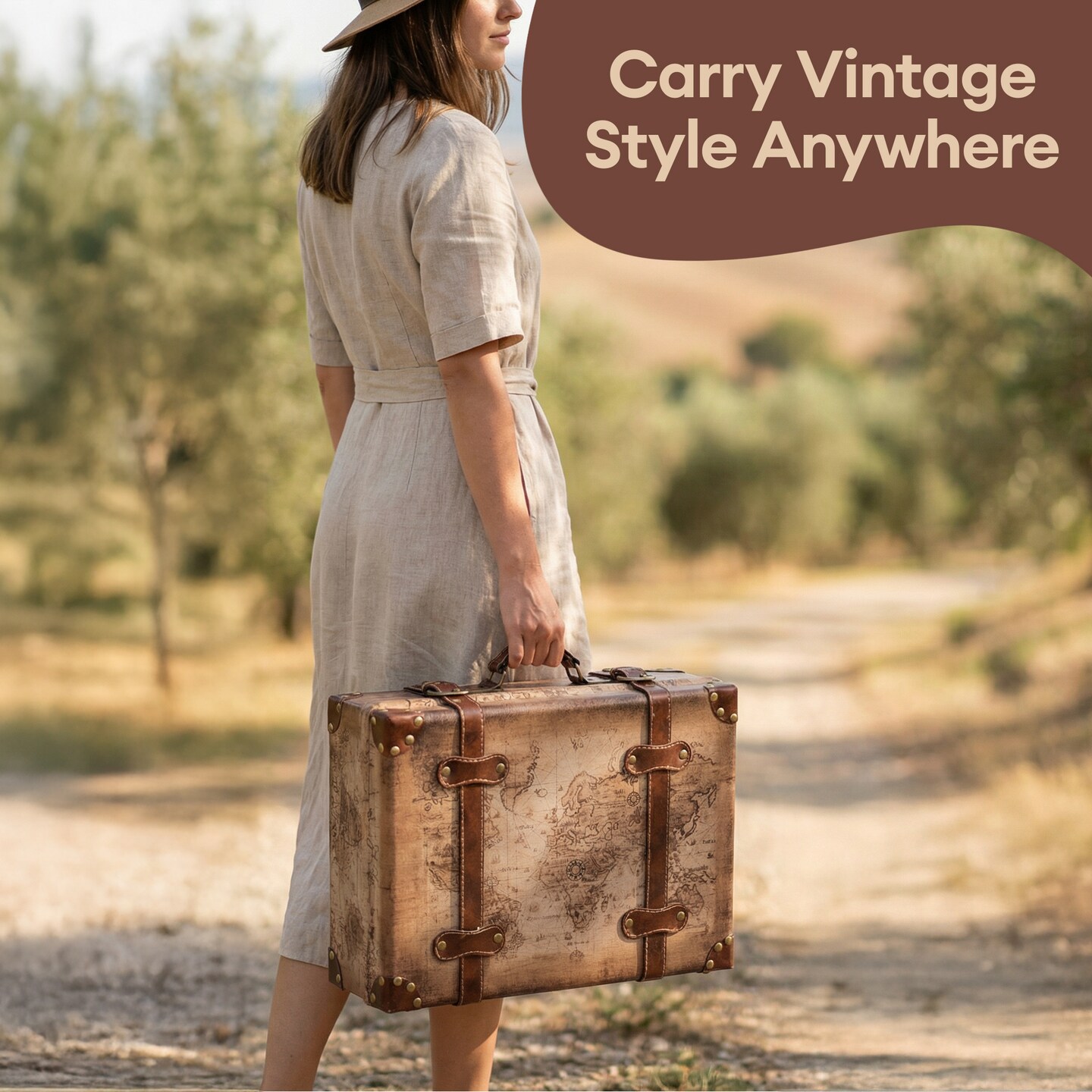 Old World Map Leather Vintage Style Suitcase with Straps, Set of 2