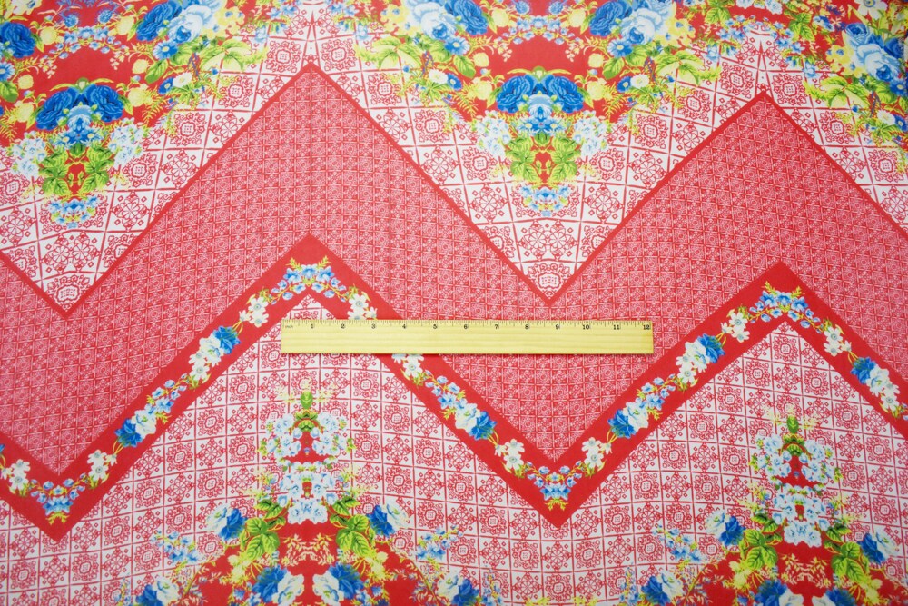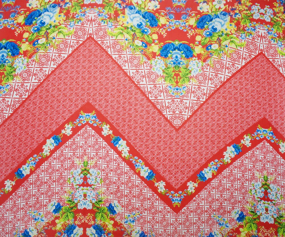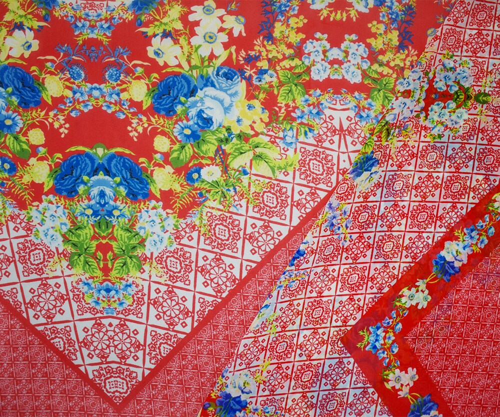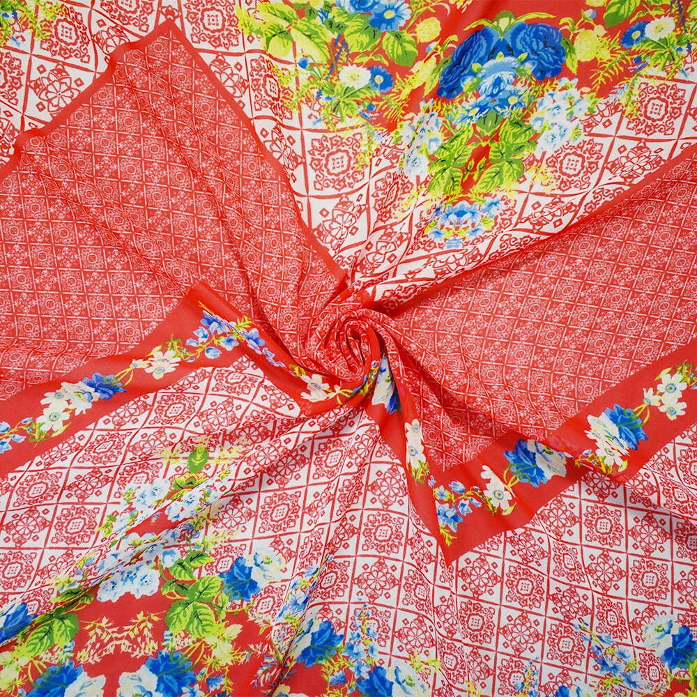 Orange-Blue-Multi Poly Floral Border Printed Chiffon Woven Fabric By the Yard