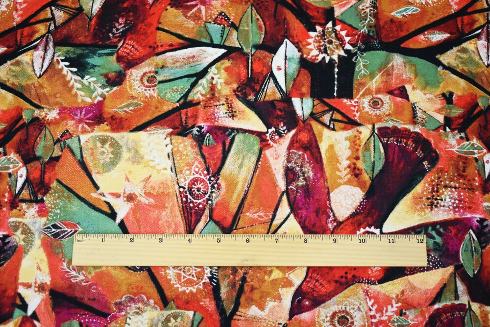 Orange-Green-Multi Abstract Bird Medallion Printed Linen Woven Fabric By the Yard