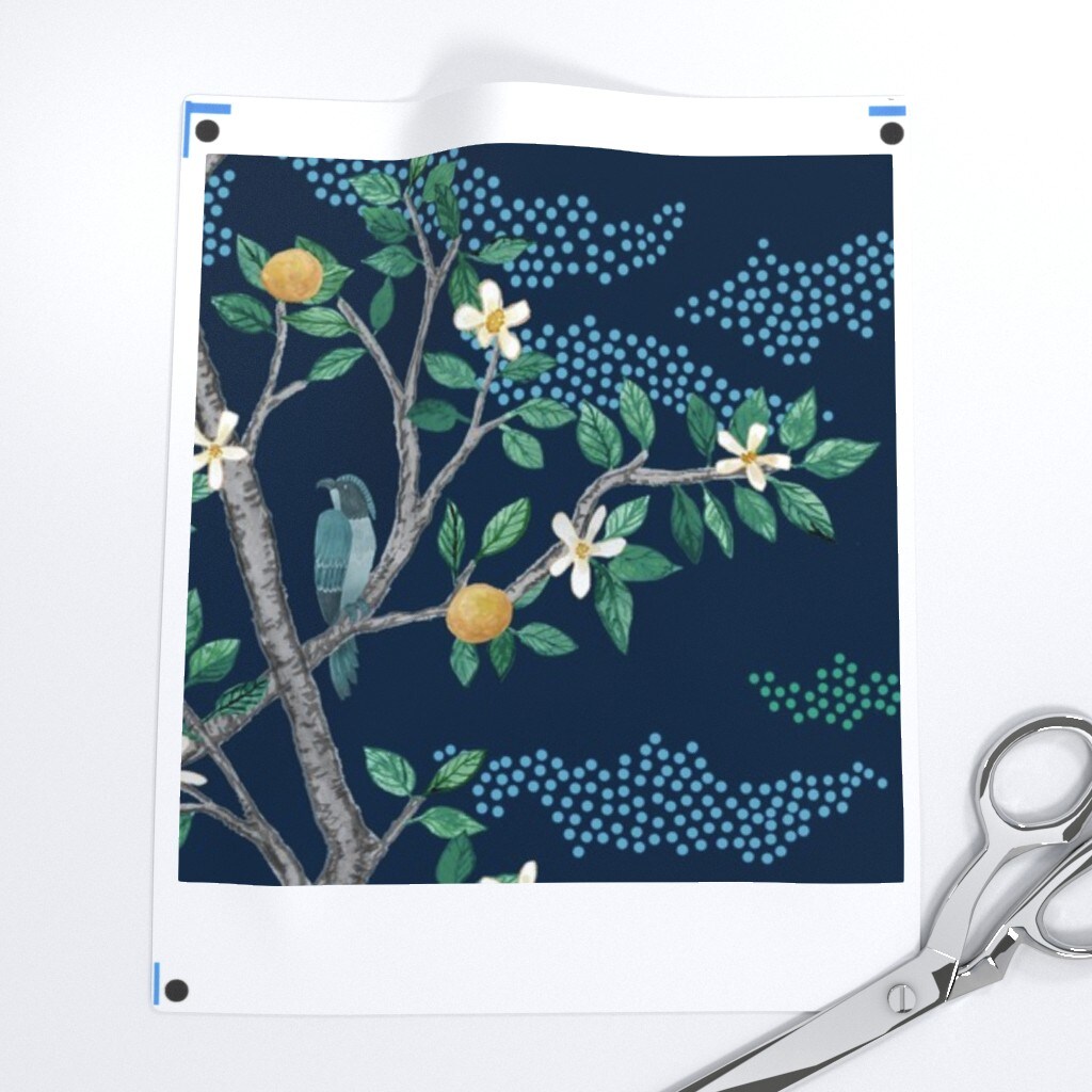 Orchard Toile Green Blue Birds Tree Large Scale Oranges Lemons Toile Chinoiserie Scenic Fruit Citrus Grove Custom Pre-pasted Wallpaper by Spoonflower Pre-Pasted Wallpaper 2FT Wide