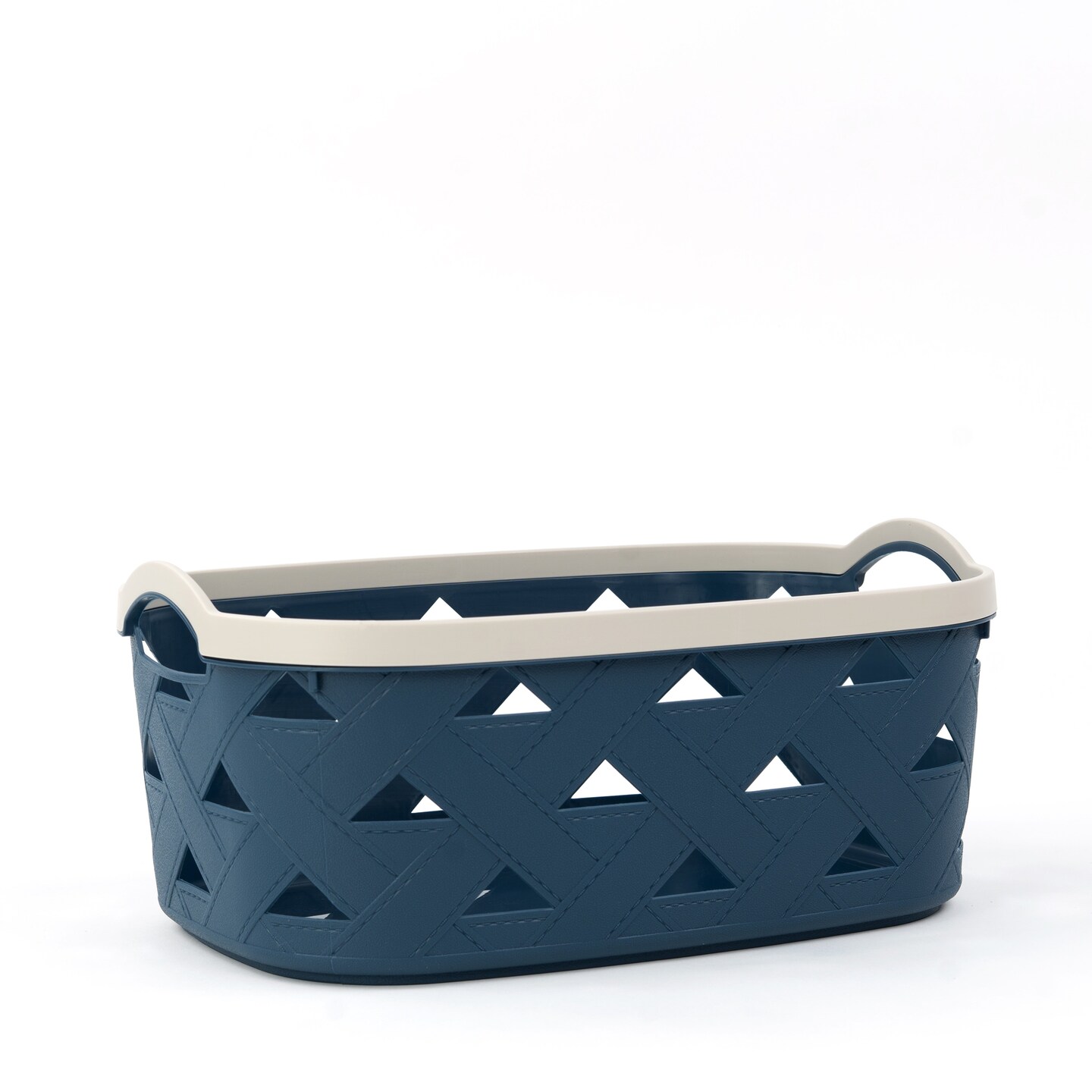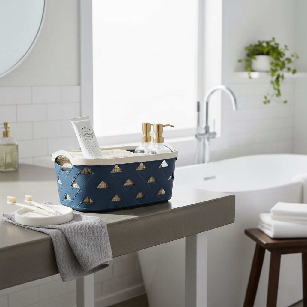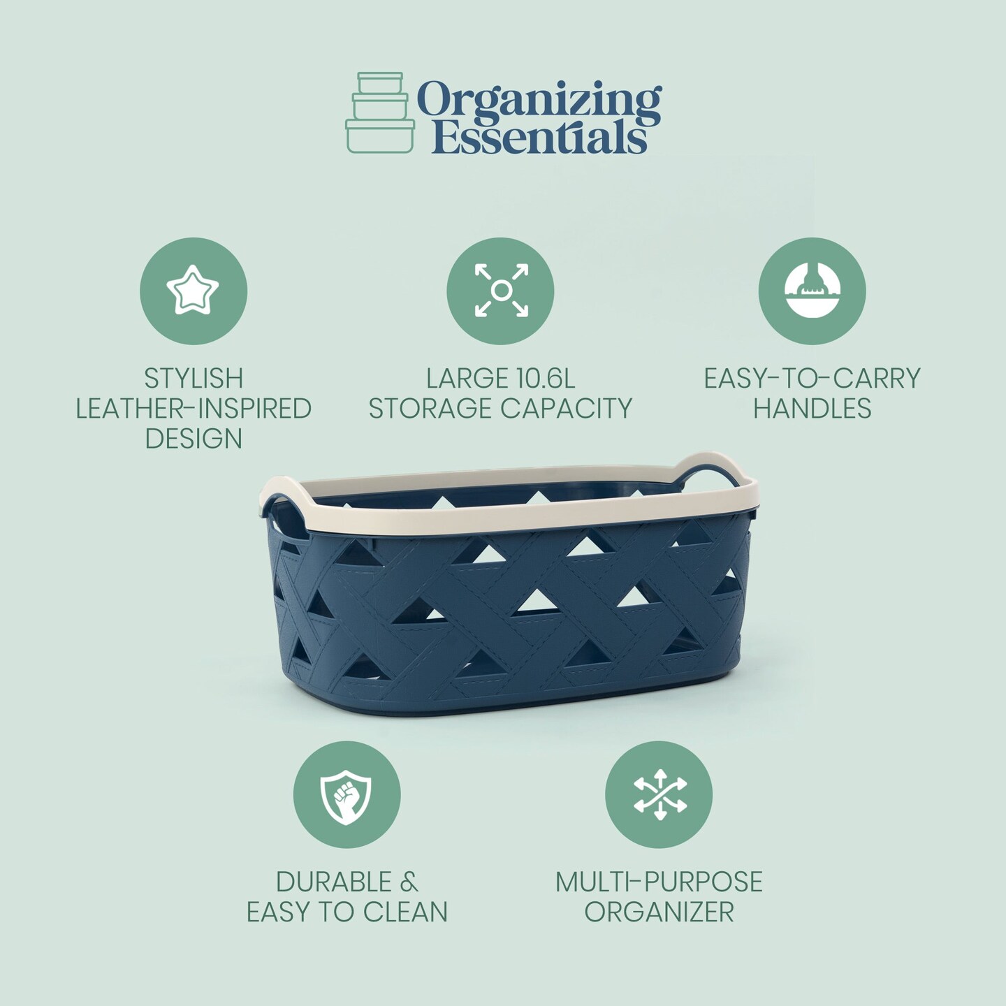 Organizing Essentials Large Plastic Storage Basket with Handles – Blue & Cream Decorative Bin for Bathroom, Kitchen, or Living Room – Designer Leather Pattern Organizer Basket, 10.6L