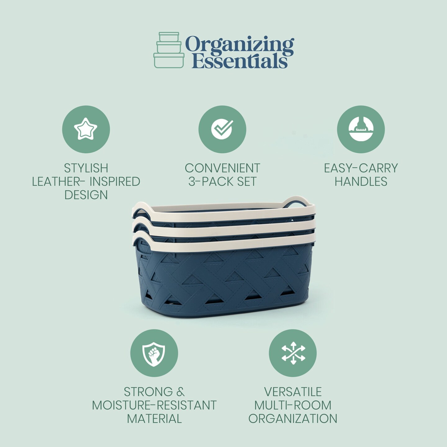 Organizing Essentials Plastic Storage Basket Set of 3 – Blue & Cream Decorative Bins with Handles for Bathroom, Kitchen, or Living Room – Designer Leather Pattern Organizer Baskets, 10.6L Each