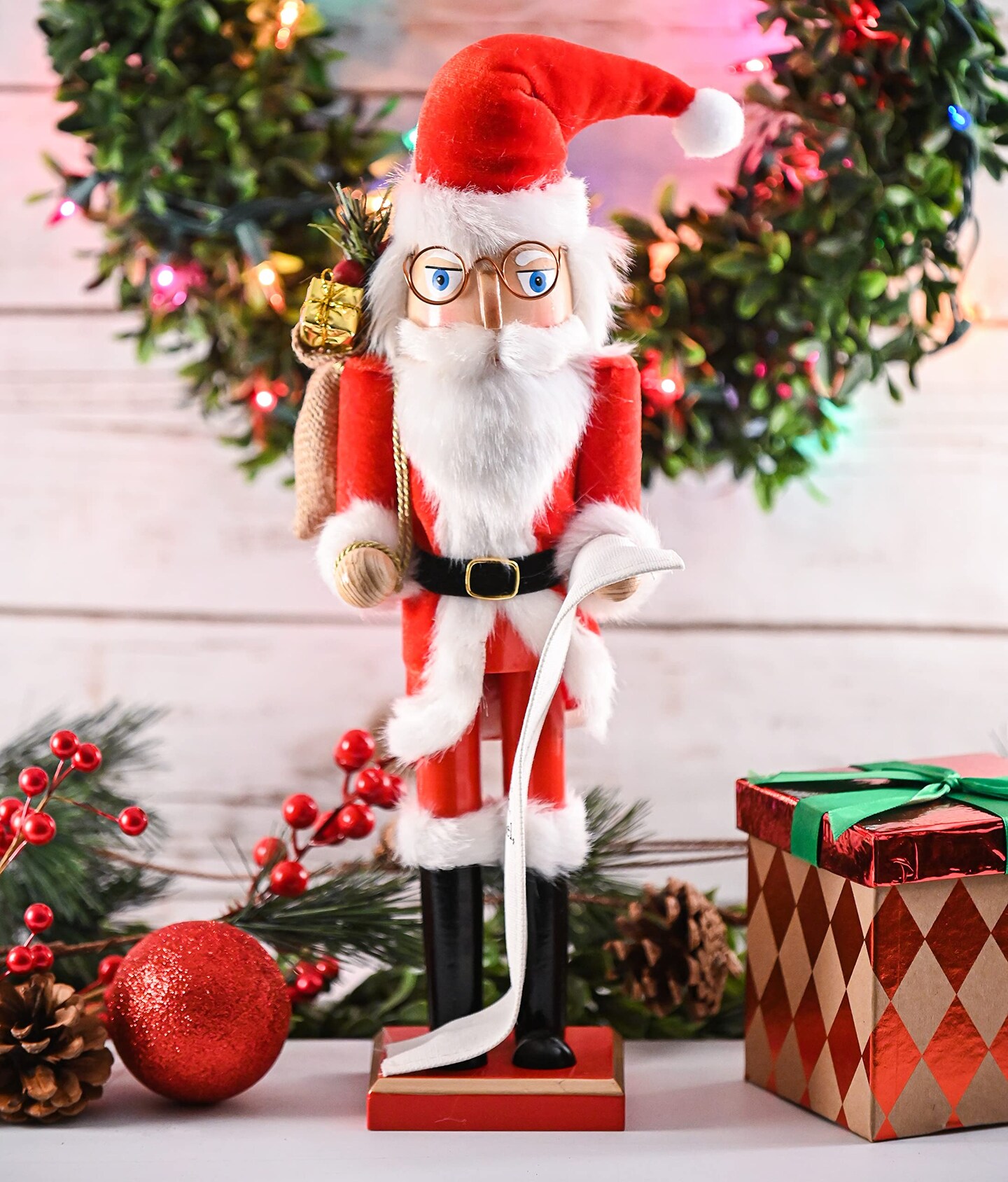 Ornativity Christmas Gift Santa Nutcracker – Red and White Wooden Nutcracker Santa Man in Traditional Santa Attire with a Bag of Gold Wrapped Gifts Over His Shoulder and a List of Names in Hand