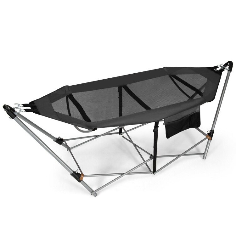 Outdoor Folding Hammock Bed with Breathable Fabric Metal Frame and Side Pocket Storage