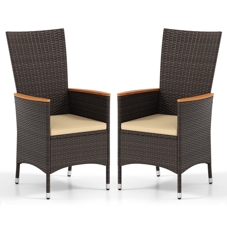 Outdoor PE Rattan Dining Chairs with Cushions High-Back Wicker Chairs with Acacia Wood Armrests