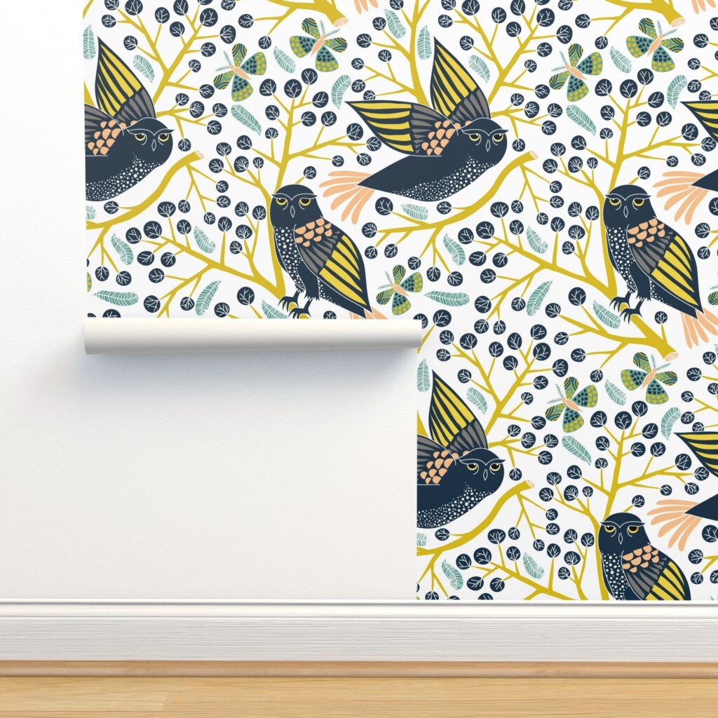 Owl Leaf Modern Butterfly Endangered Species Animals Night Custom Pre-pasted Wallpaper by Spoonflower Pre-Pasted Wallpaper 2FT Wide