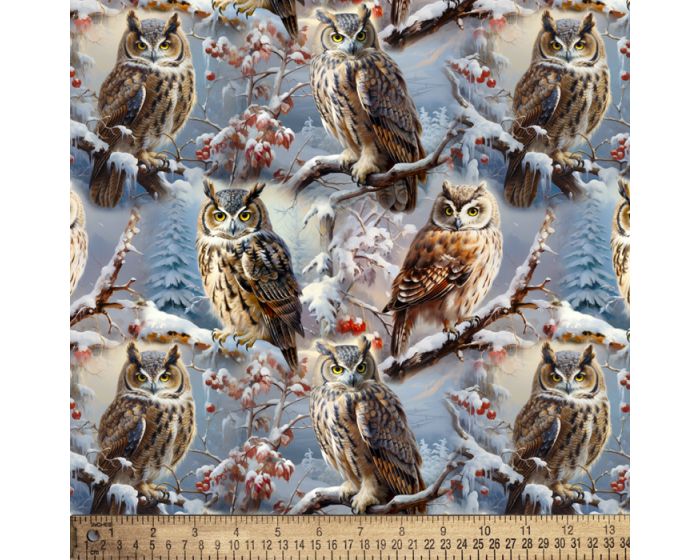 Owls Winter Snow Digital Cotton Print Fabric | By the Yard | Sewing and Crafting | 44 inches wide
