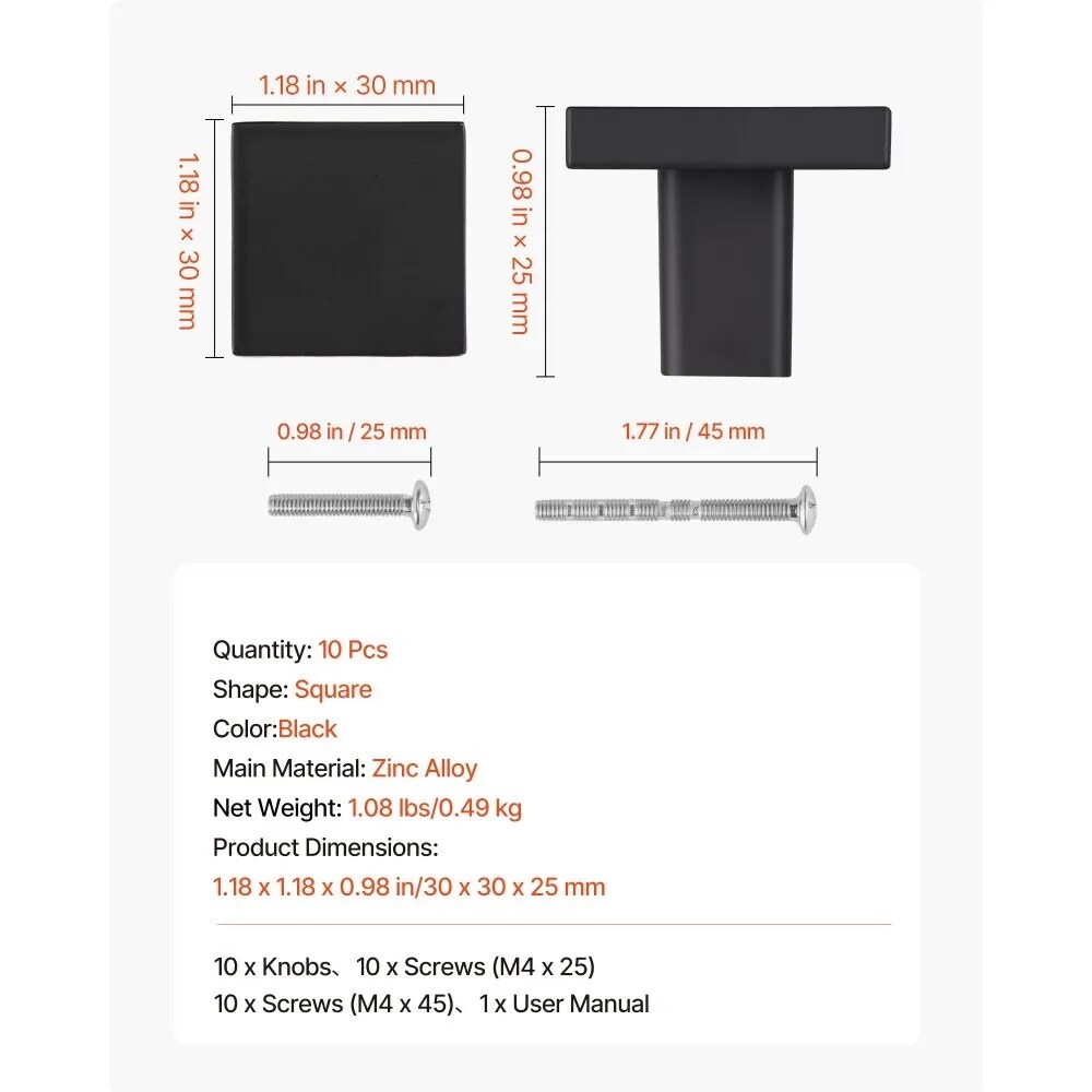 Pack of 10 Cabinet Knobs 1.18" Black Zinc Alloy Square Drawer Pulls Door Handles with Screws
