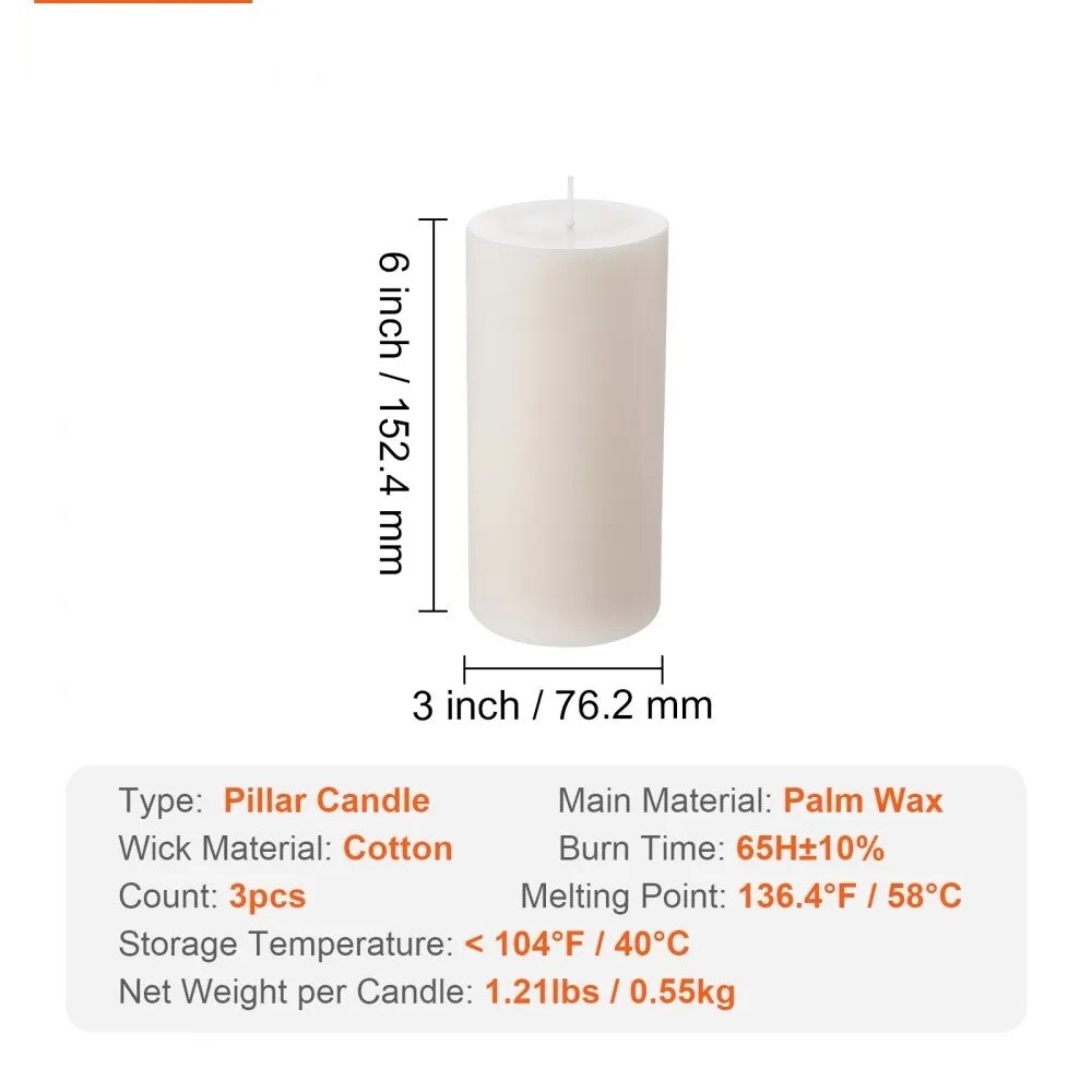 Pack of 3 White Pillar Candles 3 x 6 in Unscented Smokeless 65-Hour Long Burning Palm Wax