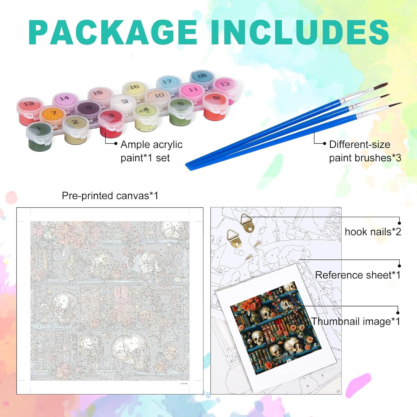 Paint by Numbers Kit for Adults – 16x16" Bookshelf & Skull DIY Acrylic Painting on Canvas, Beginner-Friendly Art Set for Relaxation, Home Wall Decor & Gift Giving