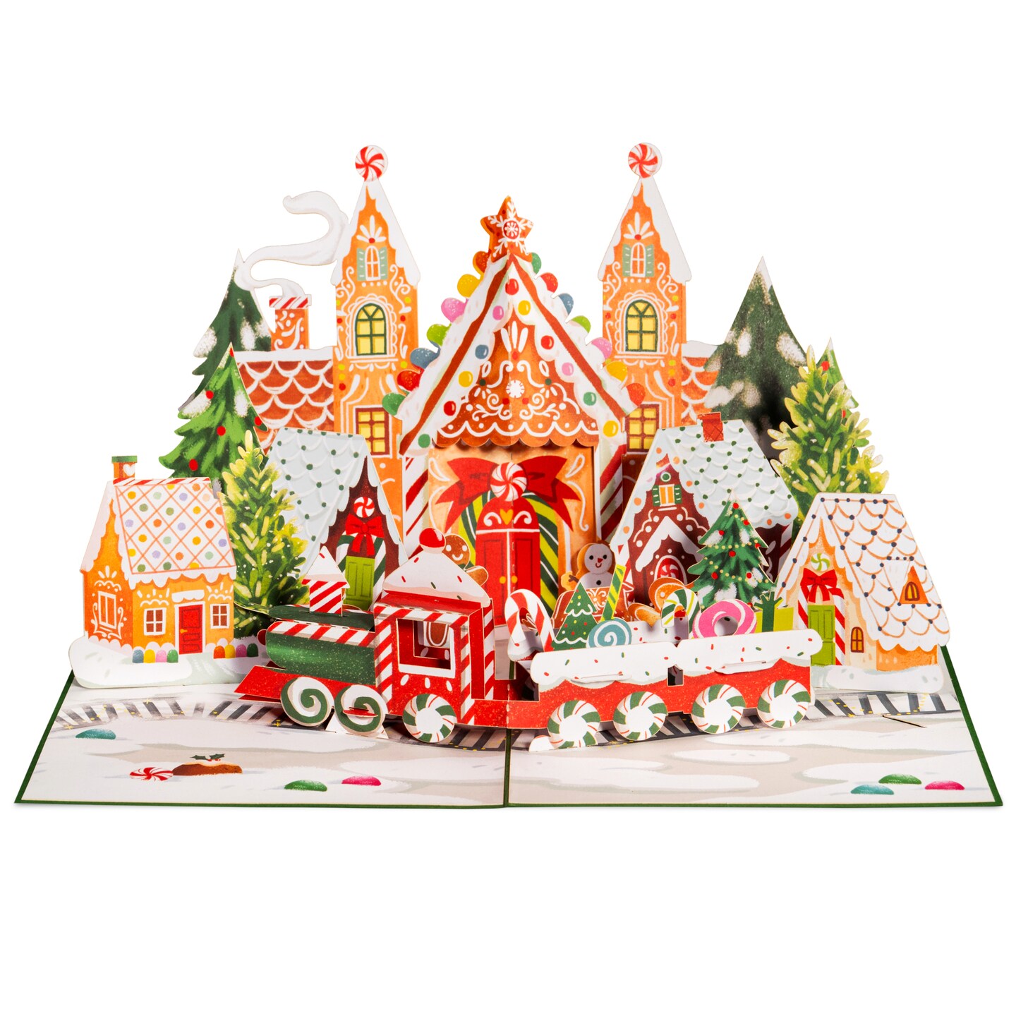 Paper Love 3D Christmas Pop Up Card - Festive Gingerbread Village & Train, Perfect for Holiday Greeting - 5" x 7" Cover