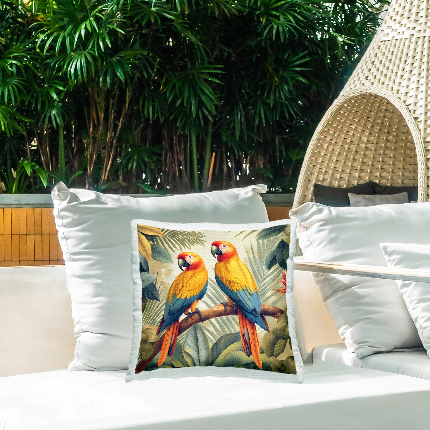 Parrot Duo on Branch Outdoor Printed Pillow Design by Steve Hunziker, 18 x 7 x 18
