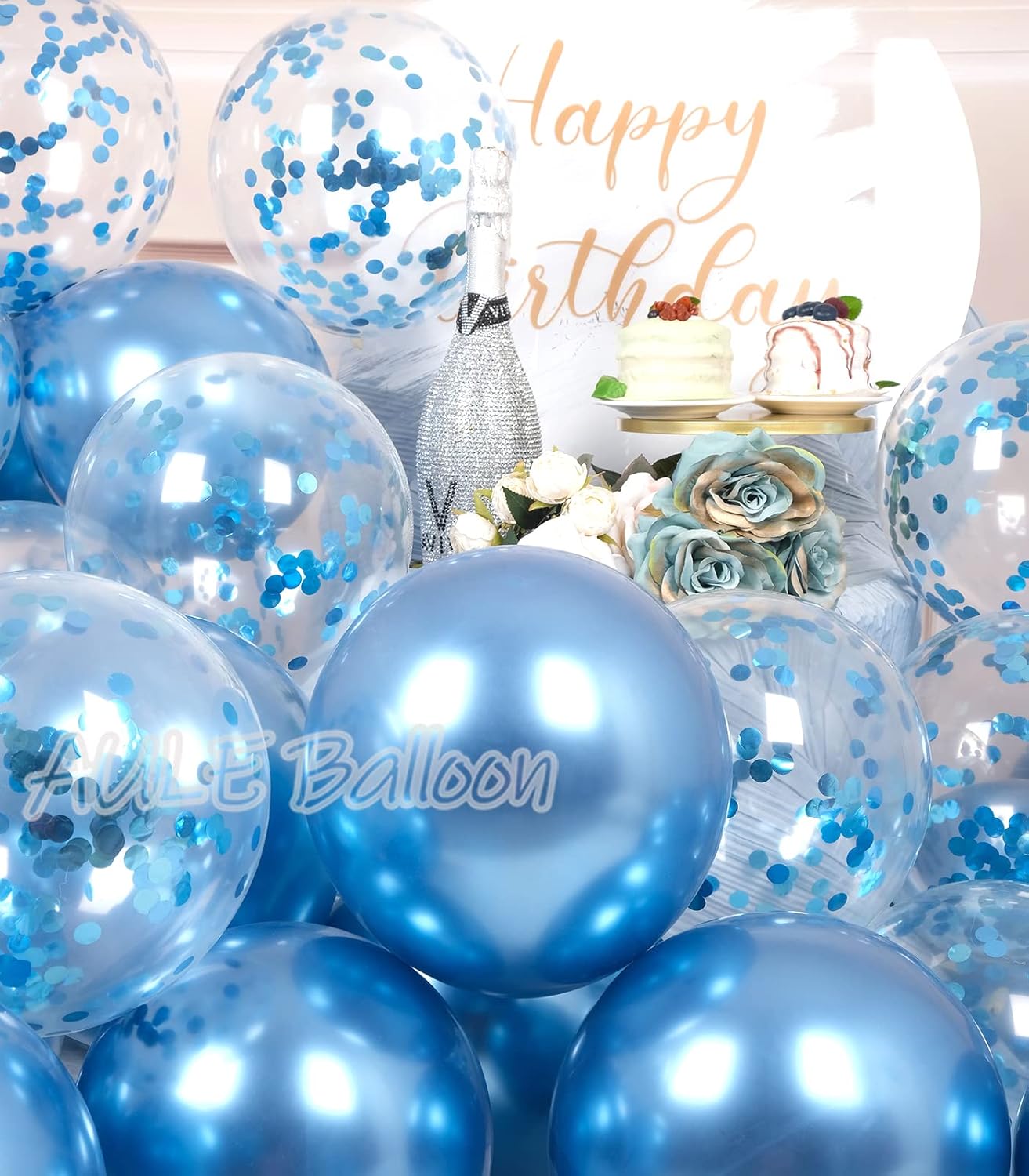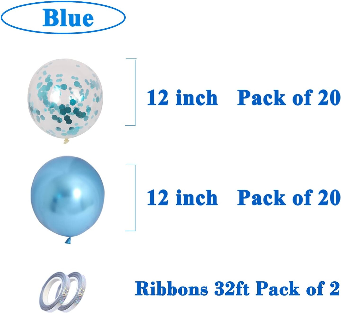Party Balloons Pack of 42 - Metallic Blue Balloons and Blue Confetti Balloons With 64ft Ribbons 12 Inch Chrome Latex Helium Balloon Decoration Set