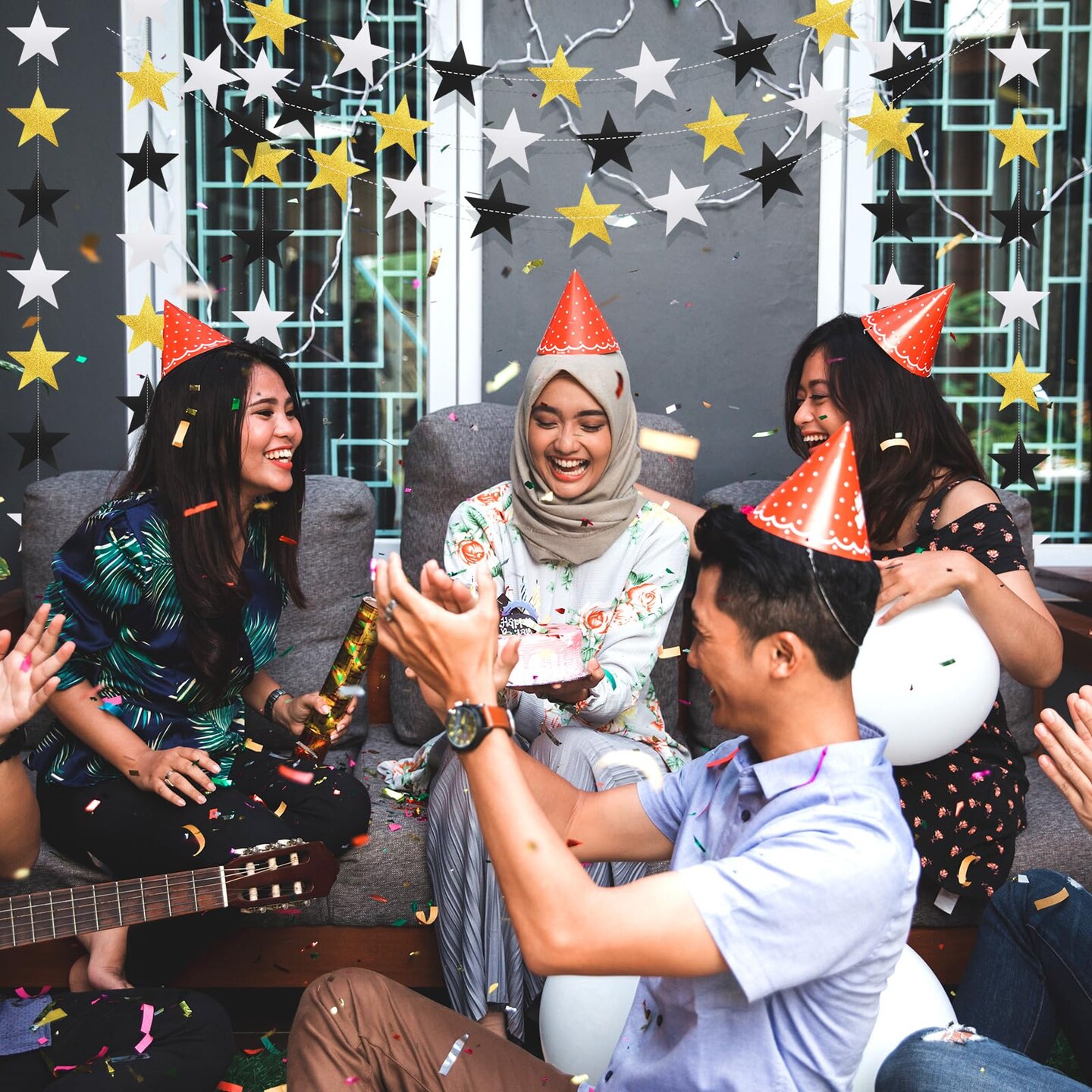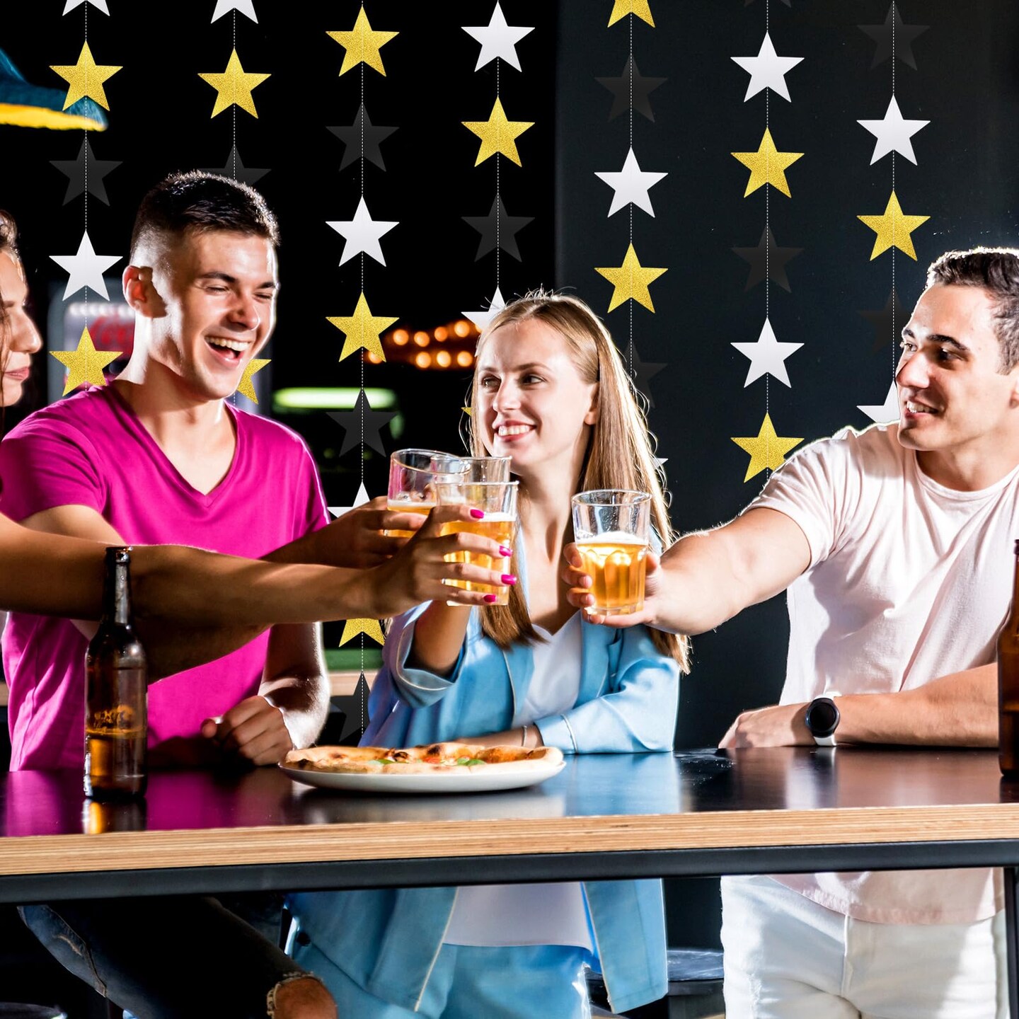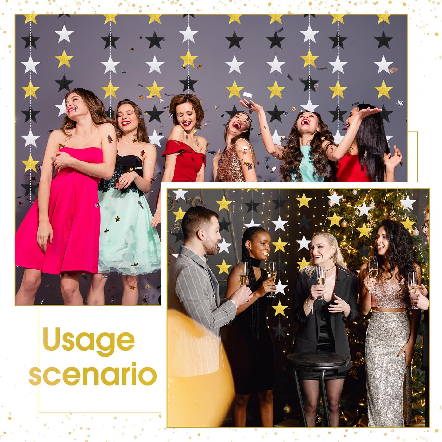 Patelai Glitter Star Garland Banner Decor, 130 Feet Bright Star Hanging Bunting Banner Backdrop for New Year Graduation Wedding Birthday Party Decor(Silver Gold Black)
