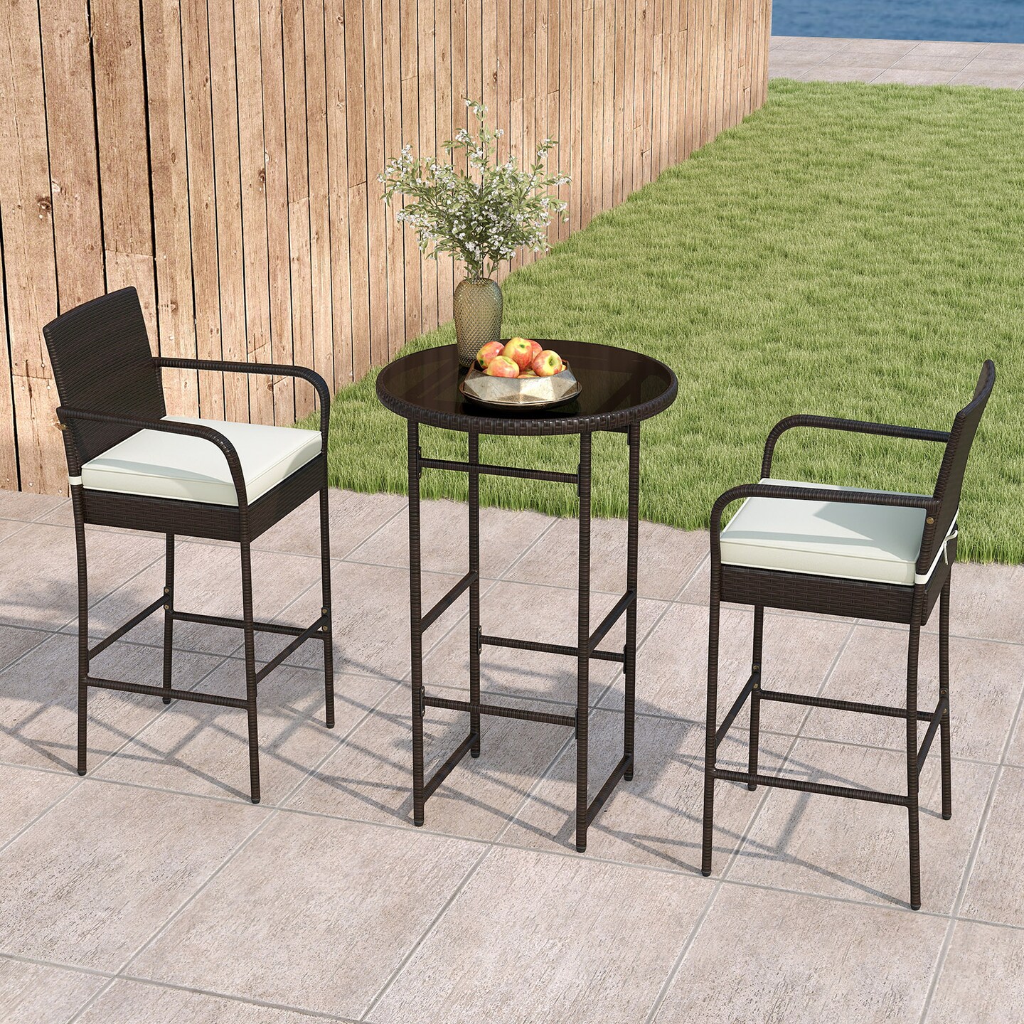 Patio Bar Set 3-Piece with Cushions and Tempered Glass Table