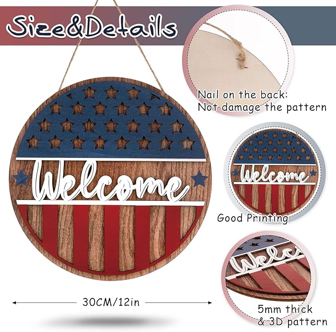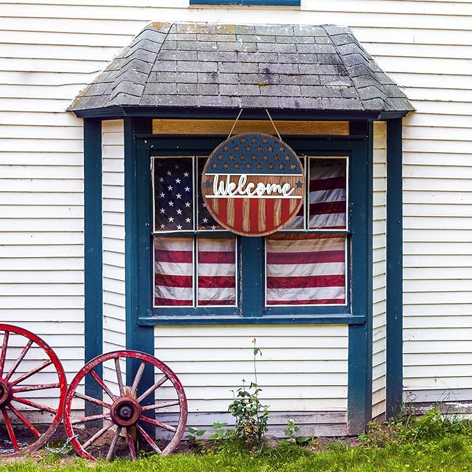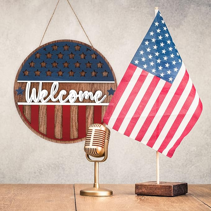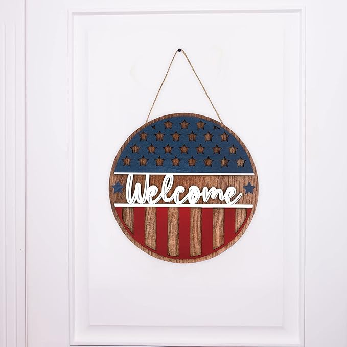 Patriotic 3D Wooden Welcome Sign, Stars and Stripes Hanging Door Wall Decoration for 4th of July, Independence Day, Memorial Day, Wreaths & Home Décor