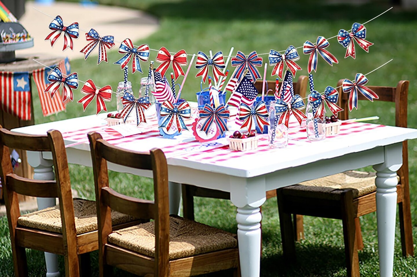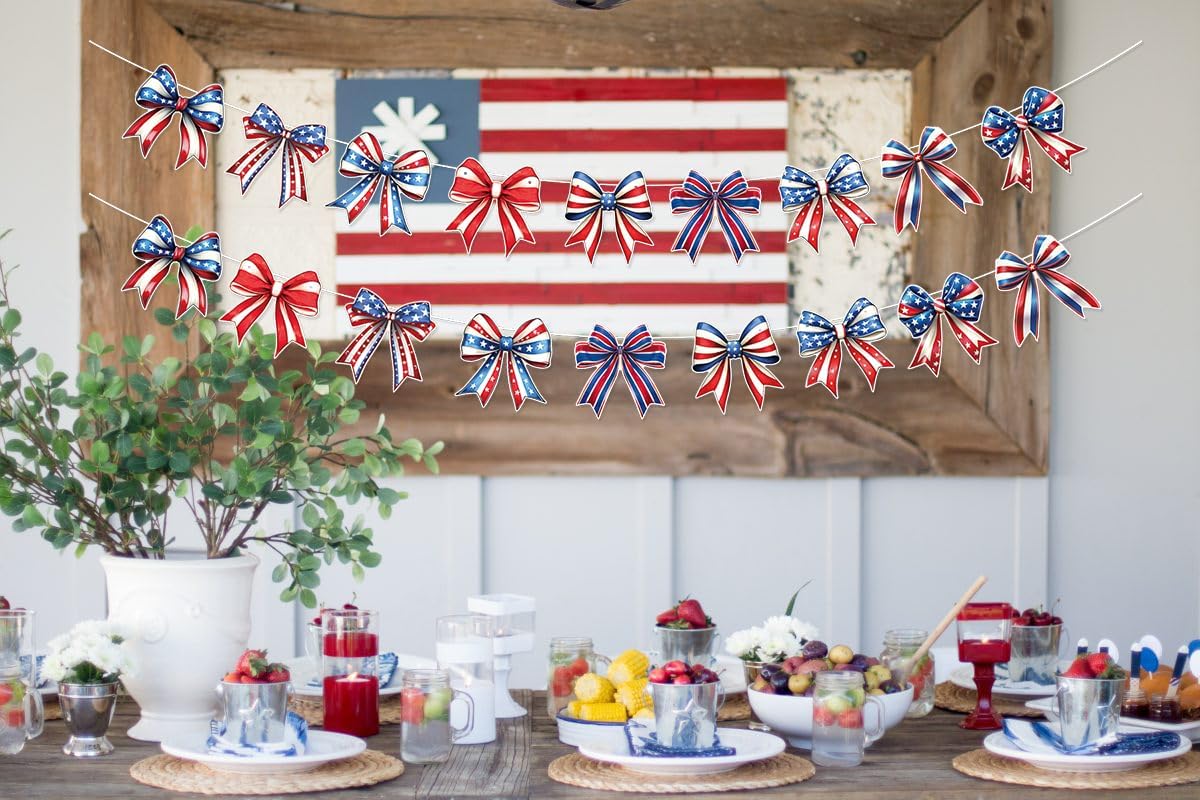 Patriotic Bows Banner Garland for 4th of July Decorations,Red White Blue Girly 4th of July Bows Banner for Patriotic,Independence Day,Memorial Day,Veteran's Day Indoor Outdoor Decorations 1SDLQ