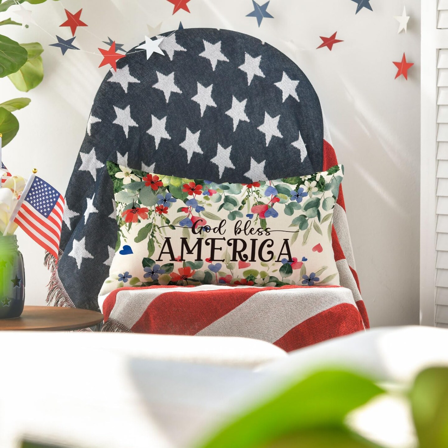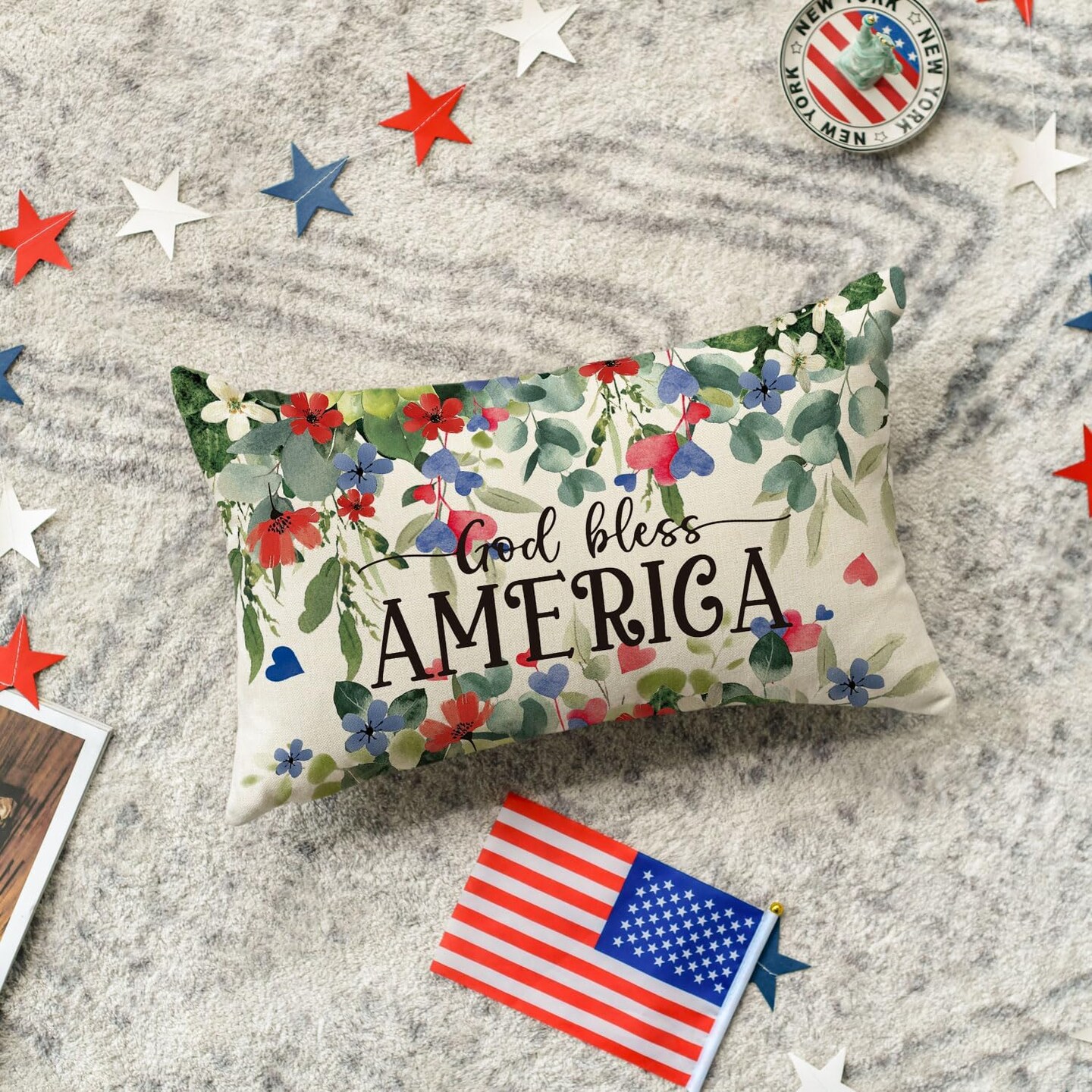 Patriotic Independence Day Throw Pillow Cover, 12 x 20 Inch God Bless America Flowers Decor Cushion Case for Sofa Couch