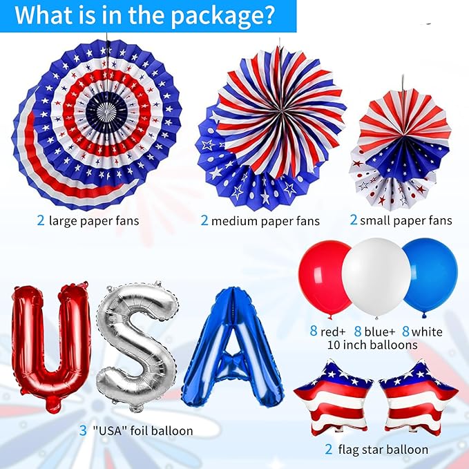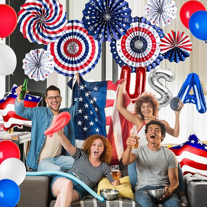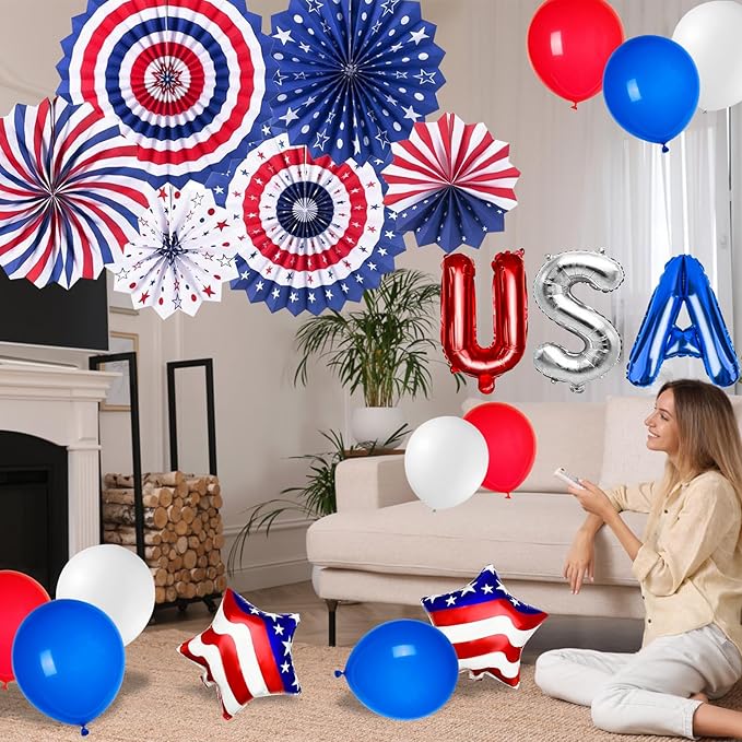 Patriotic Party Decorations Set 4th of July Decor Red White Blue Balloons, Paper Fans, UAS Star Foil Balloons for Veterans day, Labor Day, Presidents Day, Flag Day Party Decorations