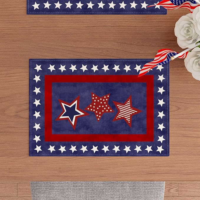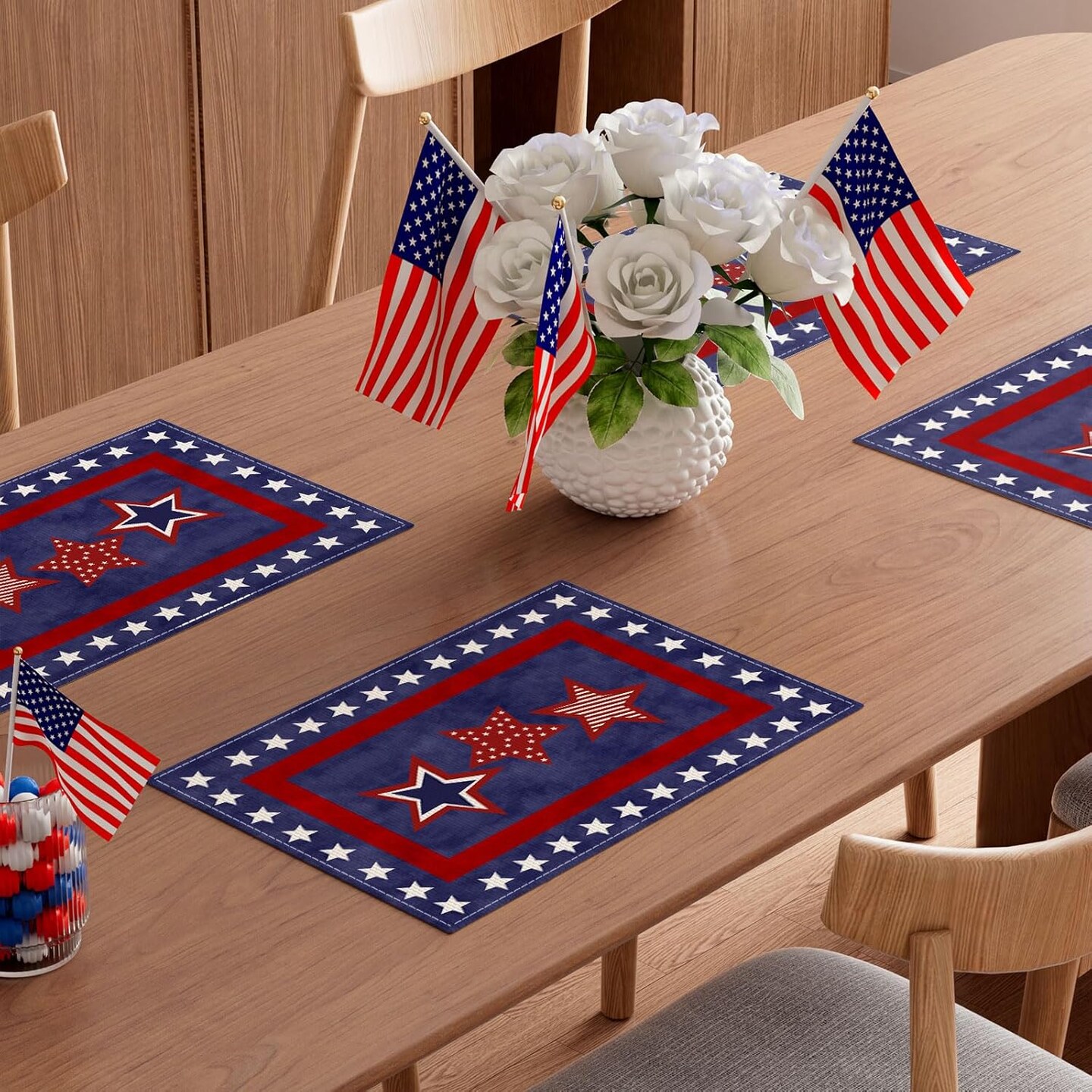 Patriotic Placemats Set of 4 - Red White and Blue Stars Table Mats for 4th of July, Memorial Day & Independence Day Decorations - 12x18 Inch Washable American Flag Themed Decor