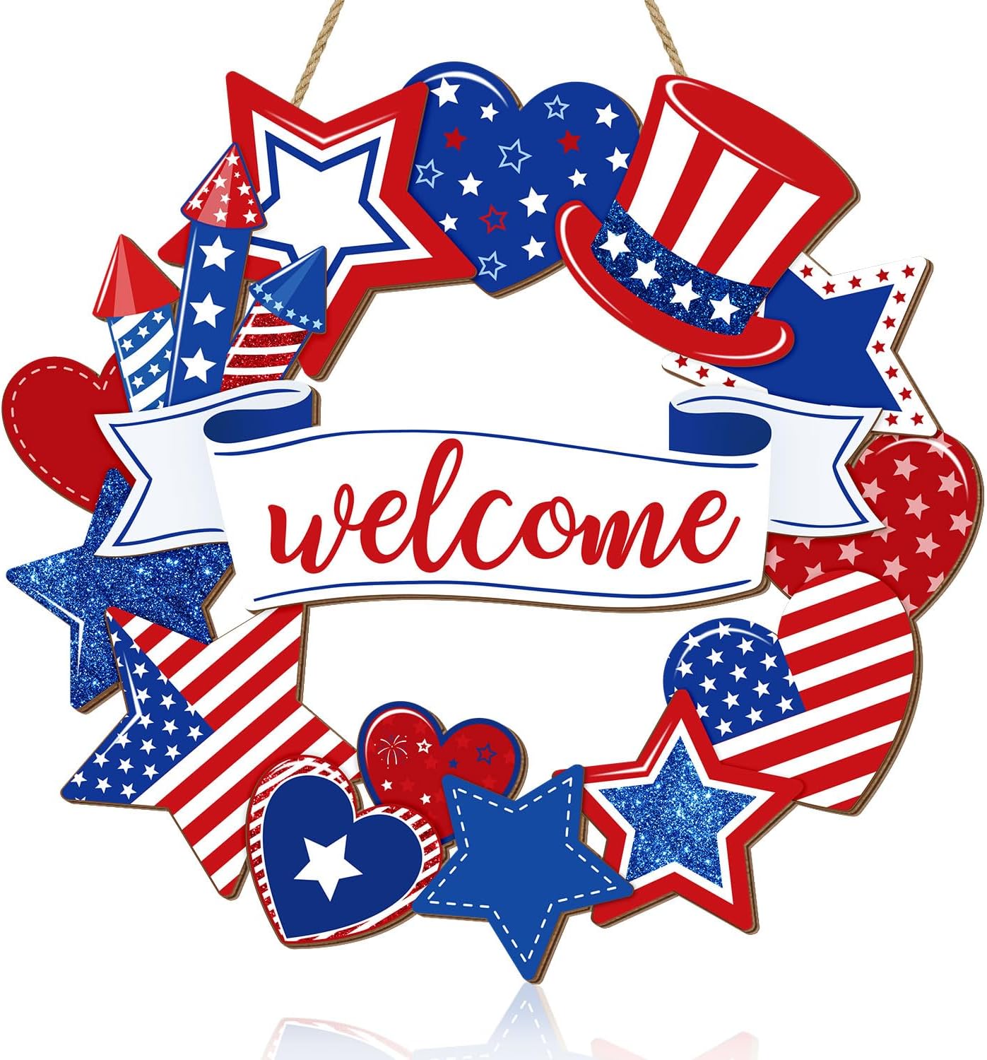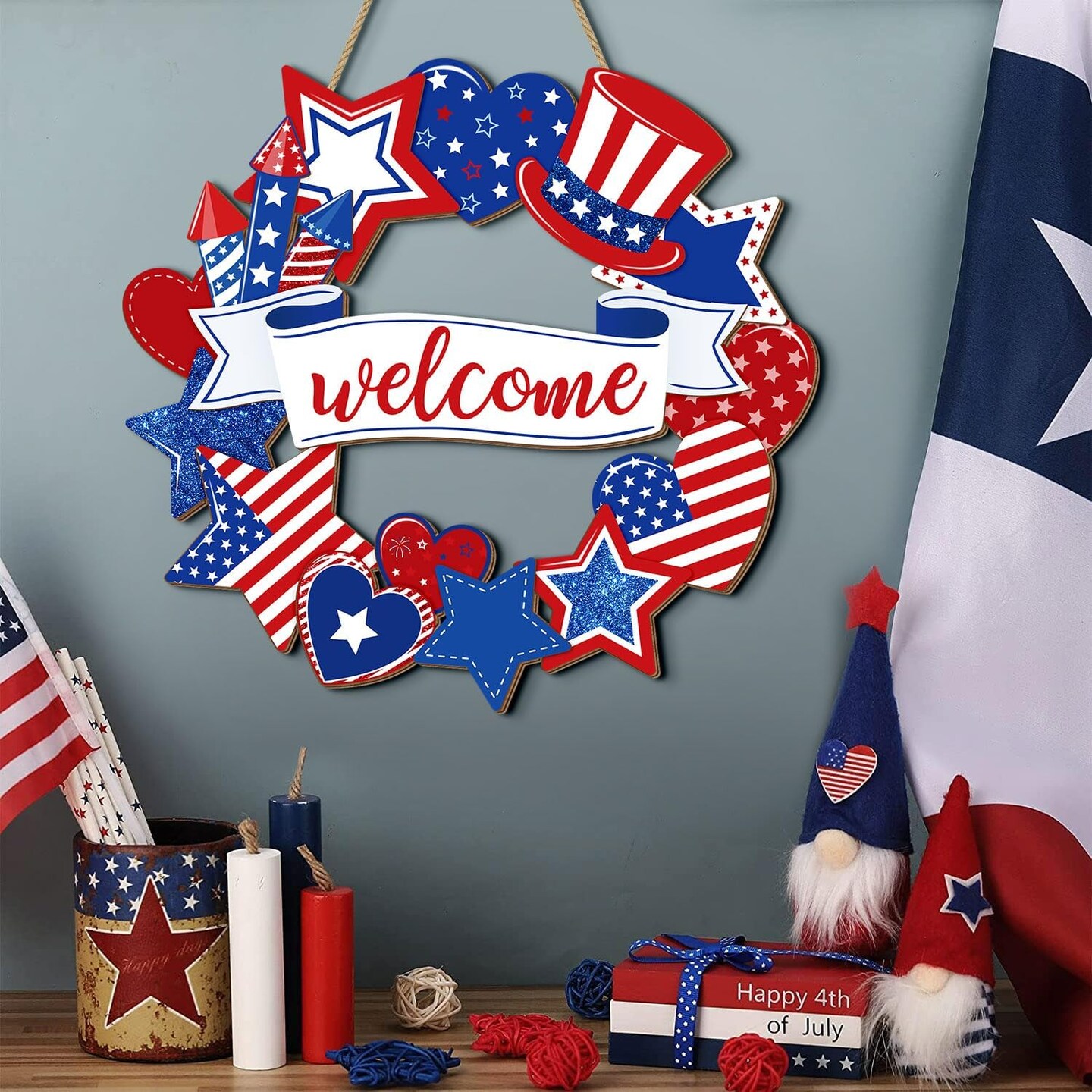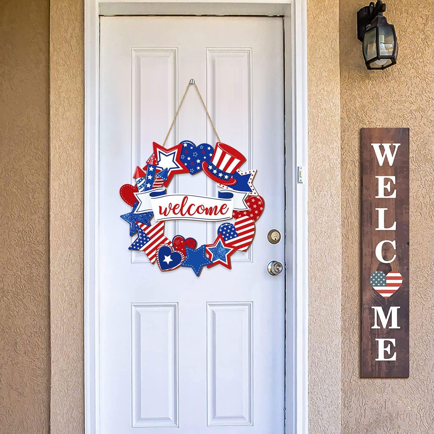 Patriotic Welcome Door Wreath Sign, 4th of July Decorations, Red White Blue Stars and Hearts Wooden Signs, American Flag USA Independence Day Wall Hanging Sign for Memorial Day Home Front Door Decor