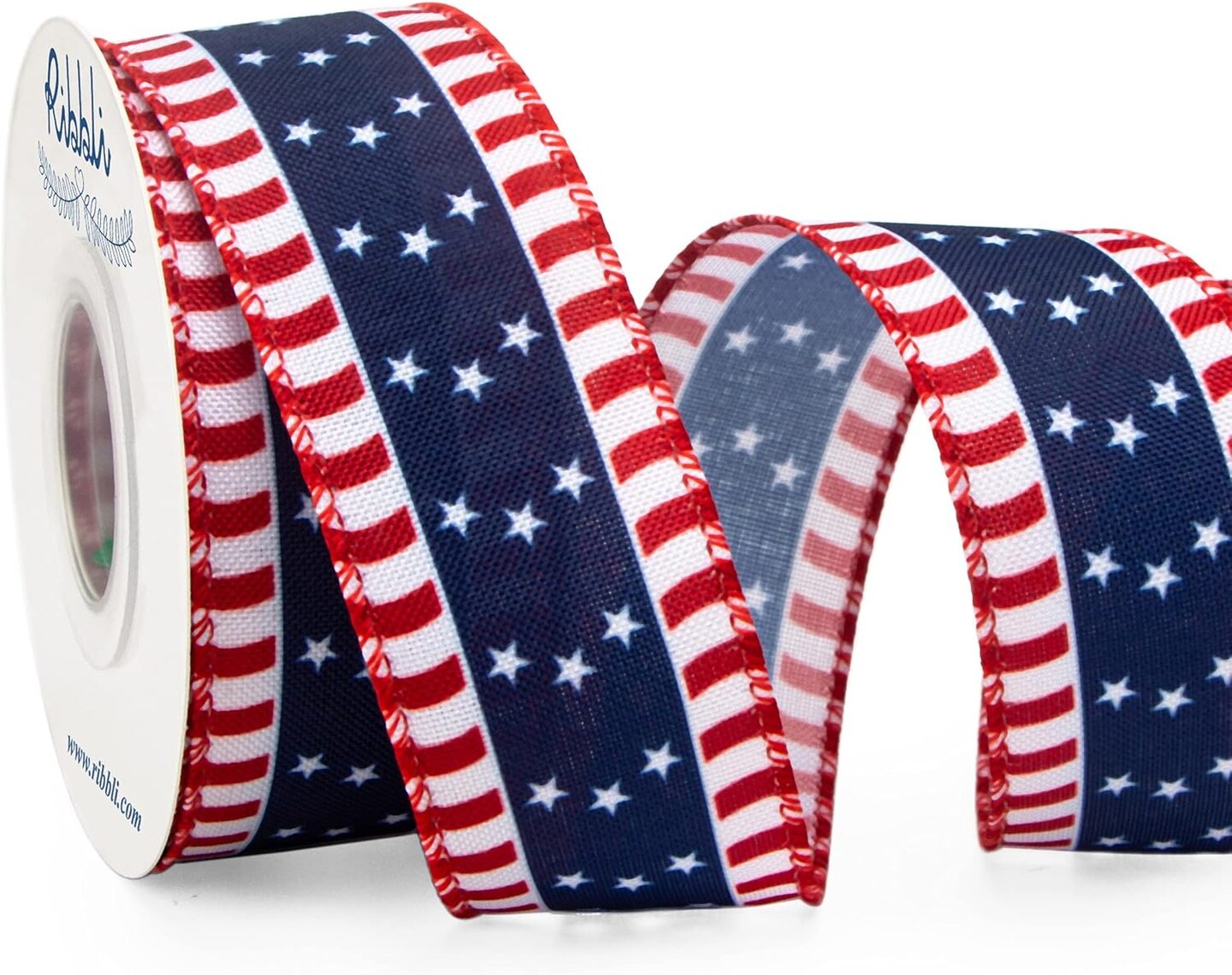 Patriotic Wired Ribbon – 1.5" x 10 Yards Red, White & Navy Stars and Stripes Canvas Ribbon for Bows, Wreaths, and Tree Decorations