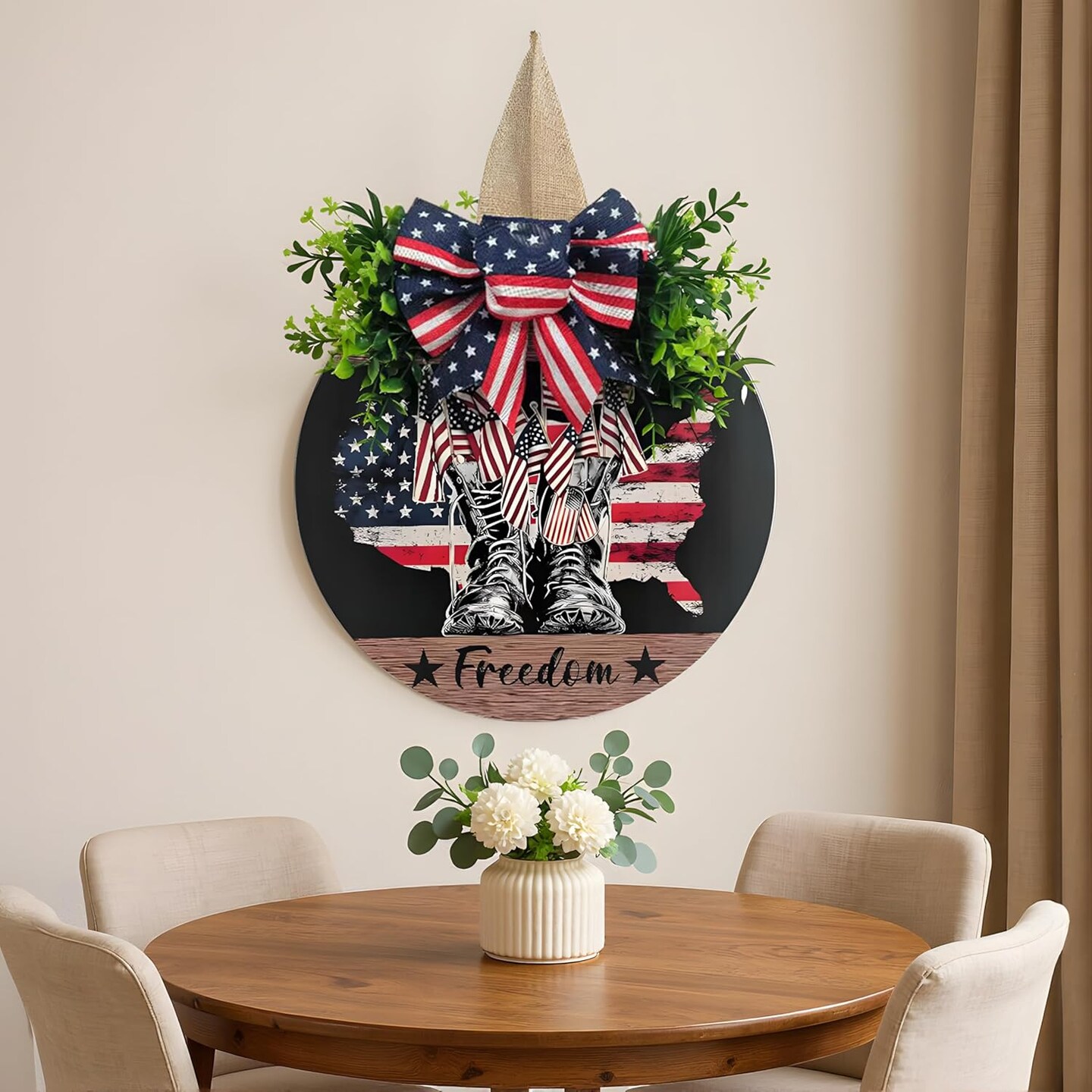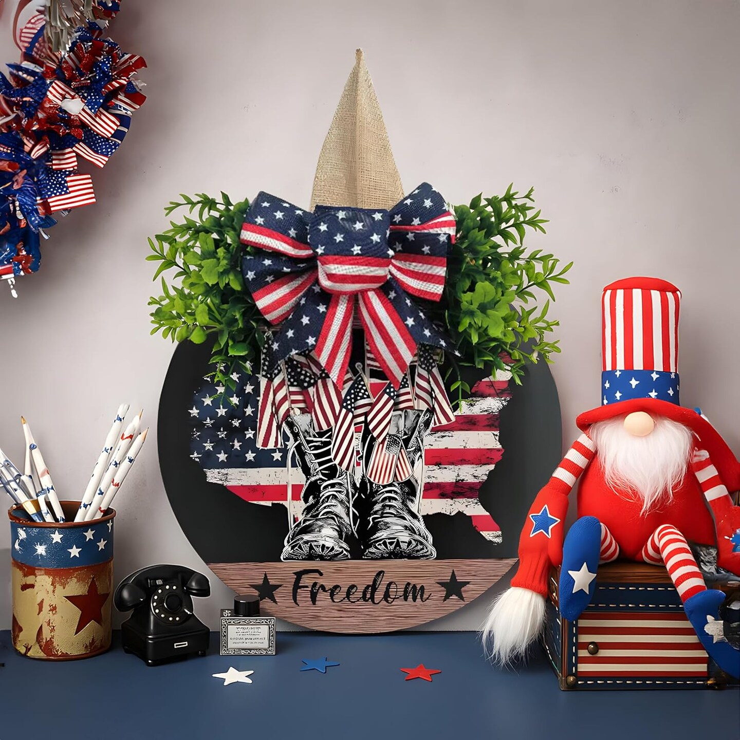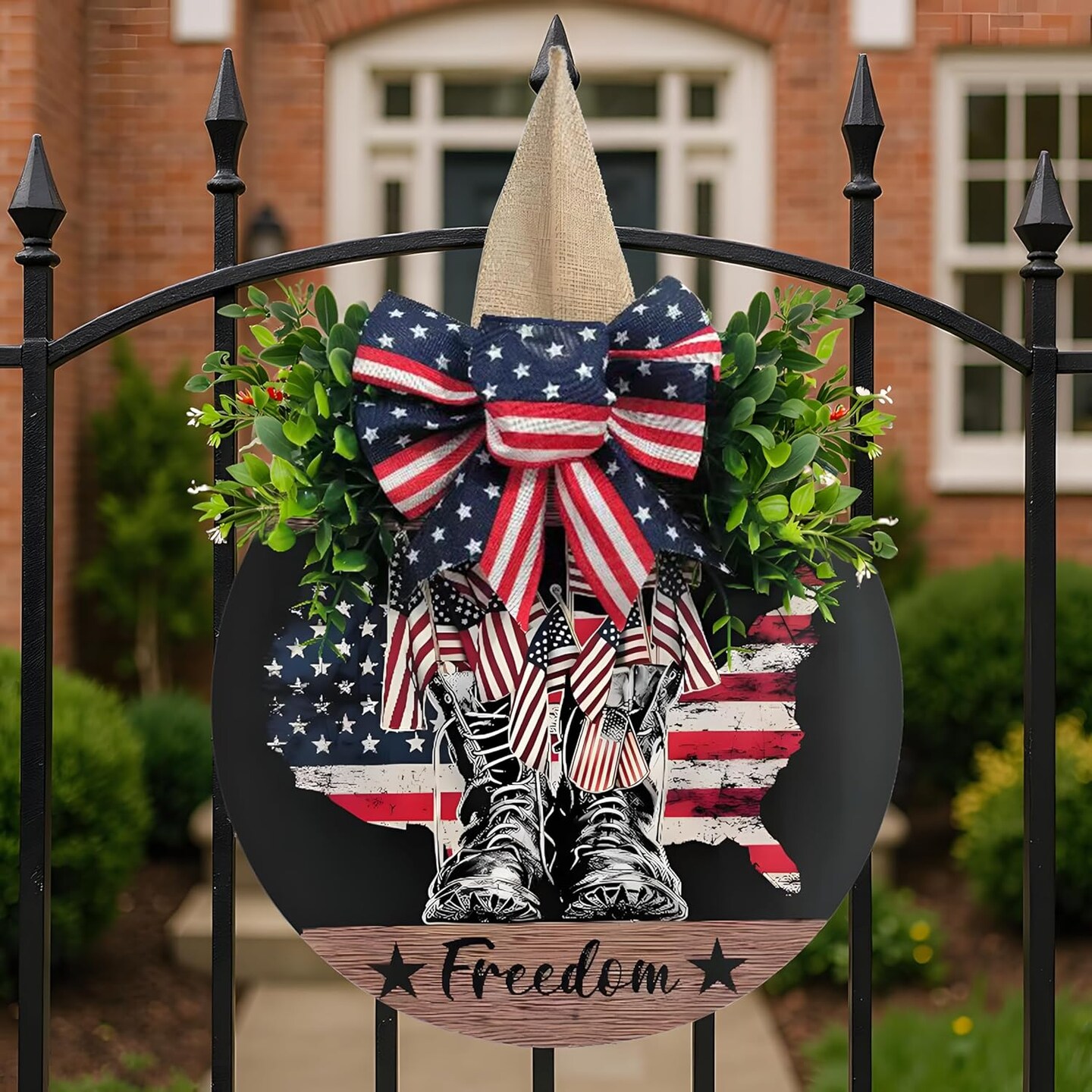 Patriotic Wreath July 4th , Memorial Day Door Decorations – 3D Independence Day Wreath with Flag, Military Boots & Faux Greenery