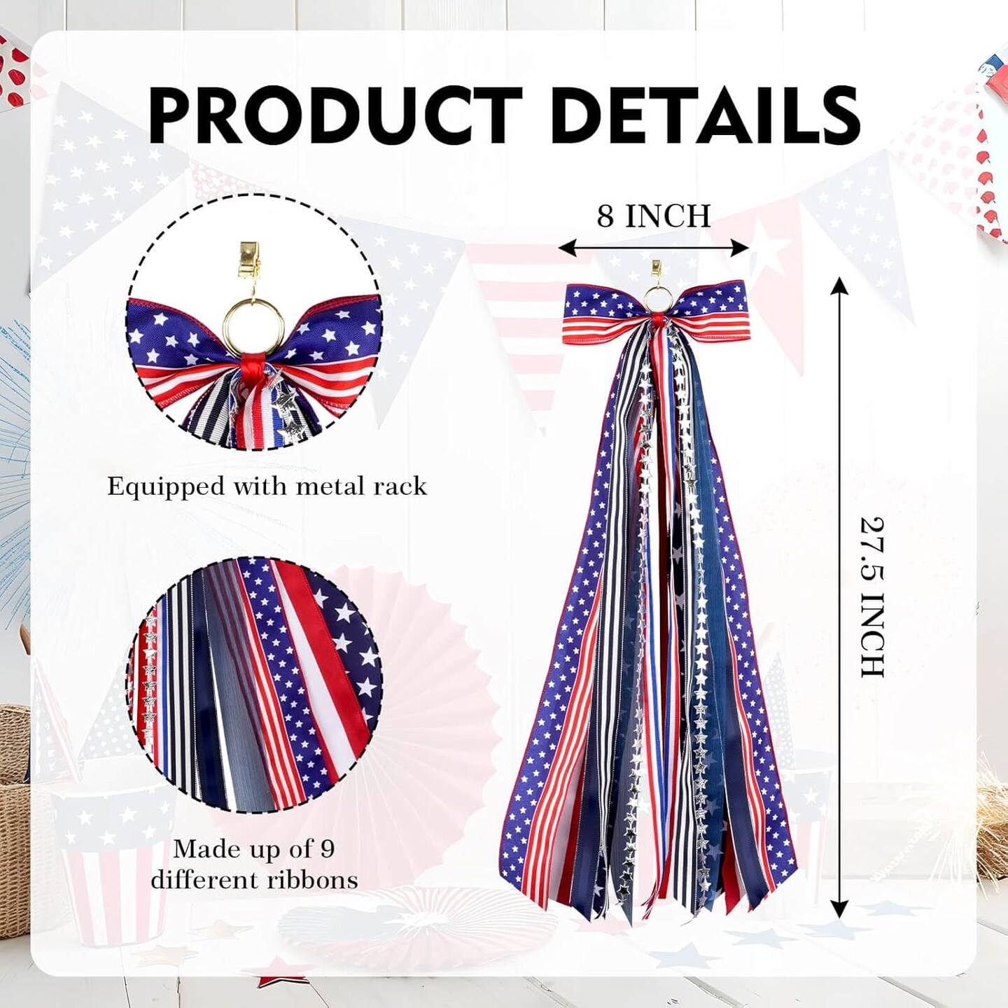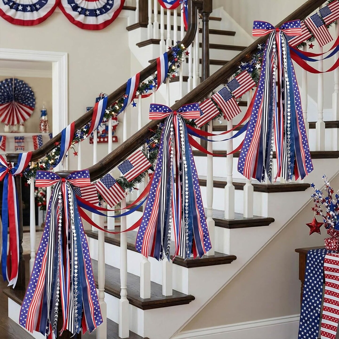 Patriotic Wreath Sash – 27.5" Red, White & Blue 9-Ribbon Bundle with Star Charm, Clip-On Bow for Front Door, 4th of July, Memorial Day & Independence Day Indoor/Outdoor Decor