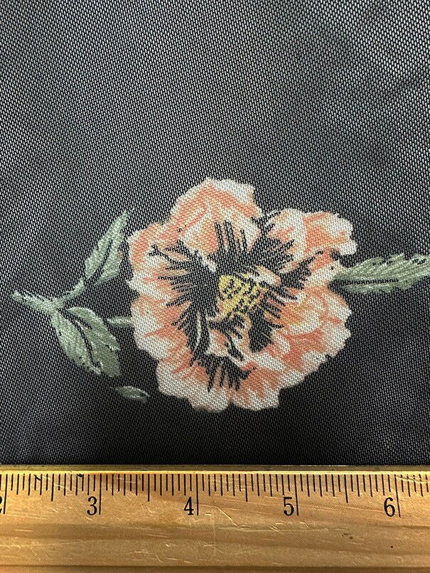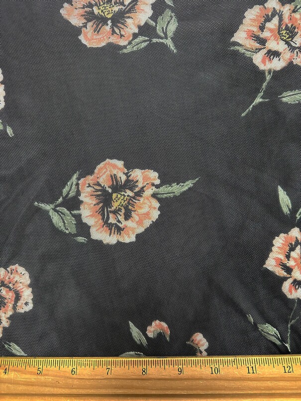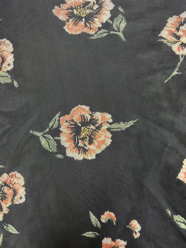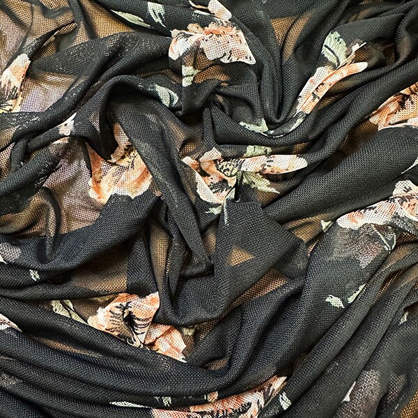 Peach on Black Floral Print Stretch Mesh Fabric By the Yard