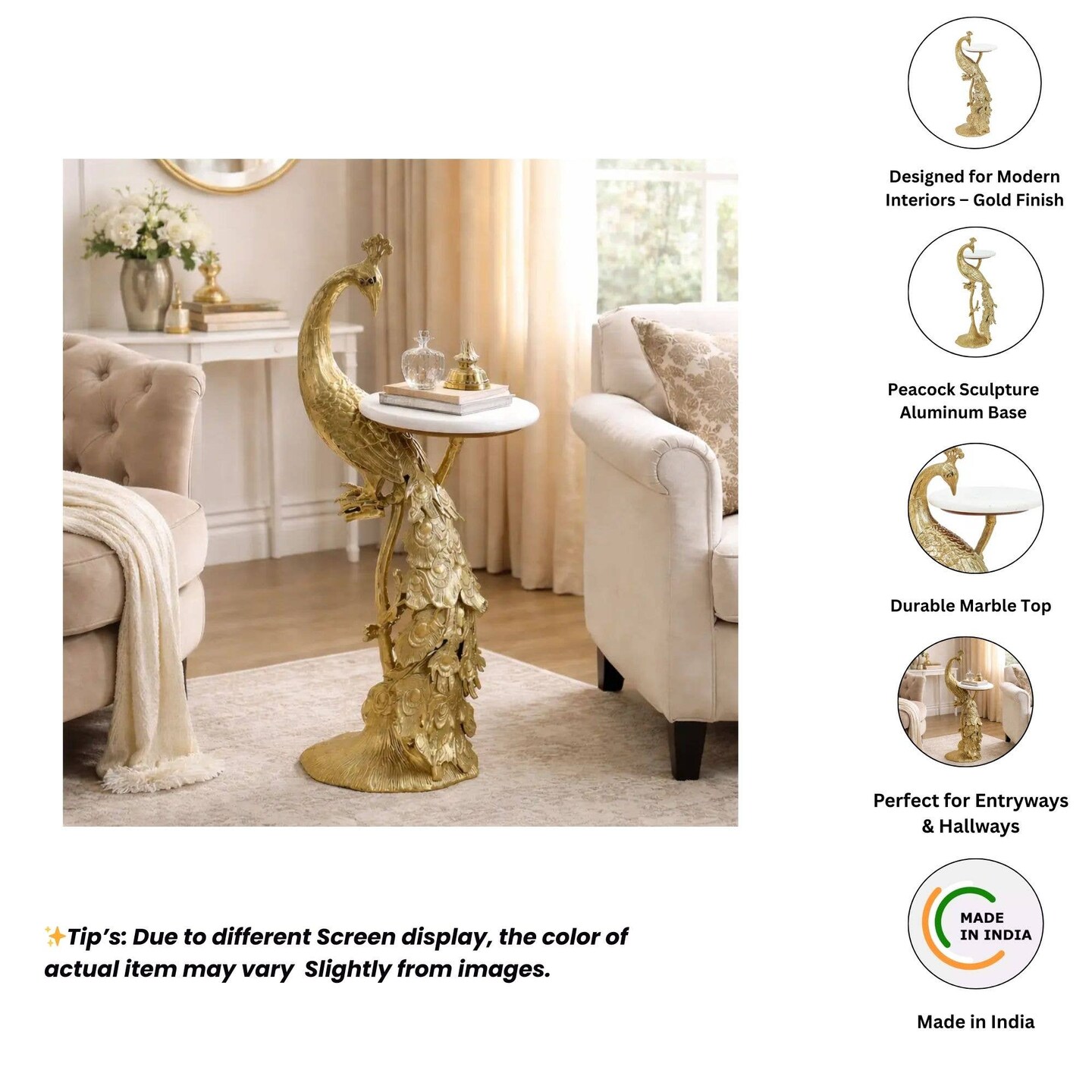 Peacock Side Table with White Marble Top | Decorative Sculptural End Table | Aluminum Base | Gold Accent Table for Living Room | 10x10x29"