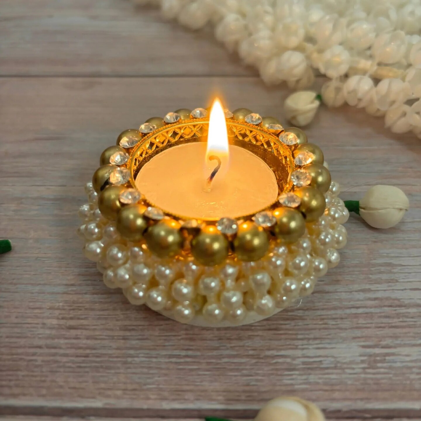 Pearl Tealight Candle Holder Festival of Light Decorative T-light Holder for Diwali Navratri Christmas Thanksgiving Housewarming Gift Candle Stand for Centerpiece Dining Table Home Decor