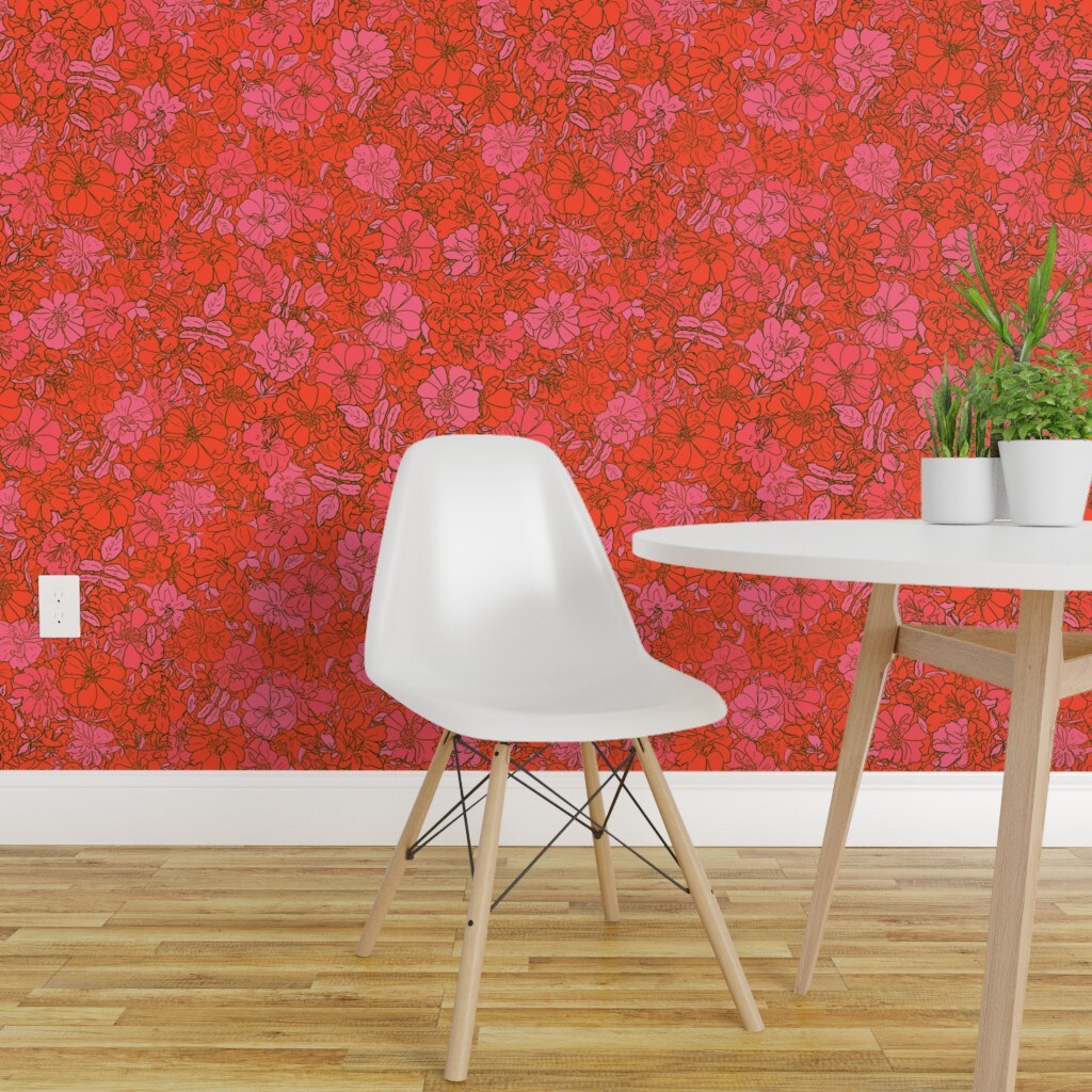 Peel & Stick Wallpaper 2FT Wide Red Floral Pink Retro Flowers Hand Drawn Small Scale Monochromatic Custom Removable Wallpaper by Spoonflower