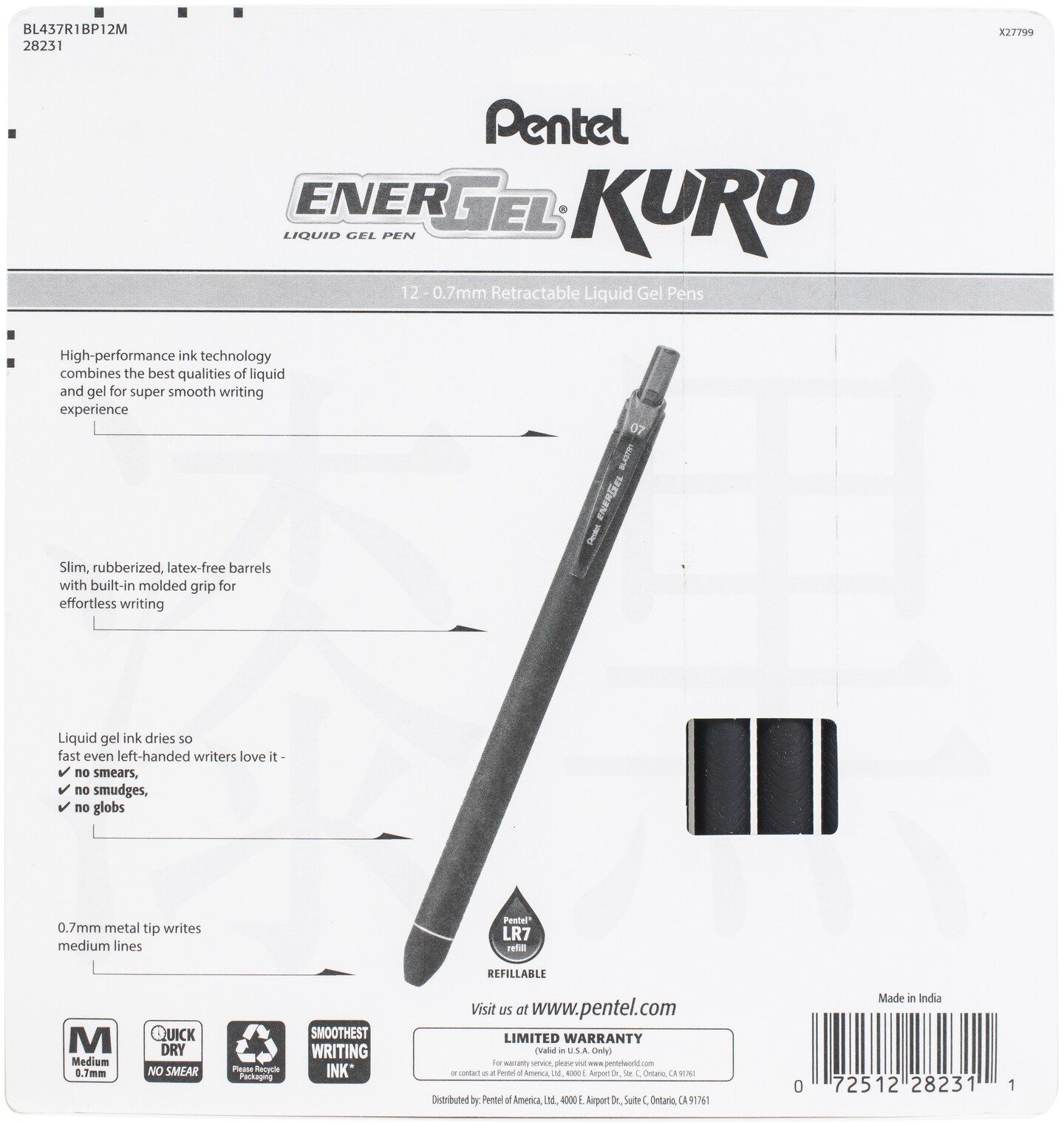 Pentel EnerGel Kuro Liquid Gel Pens .7mm 12/Pkg-Assorted Colors