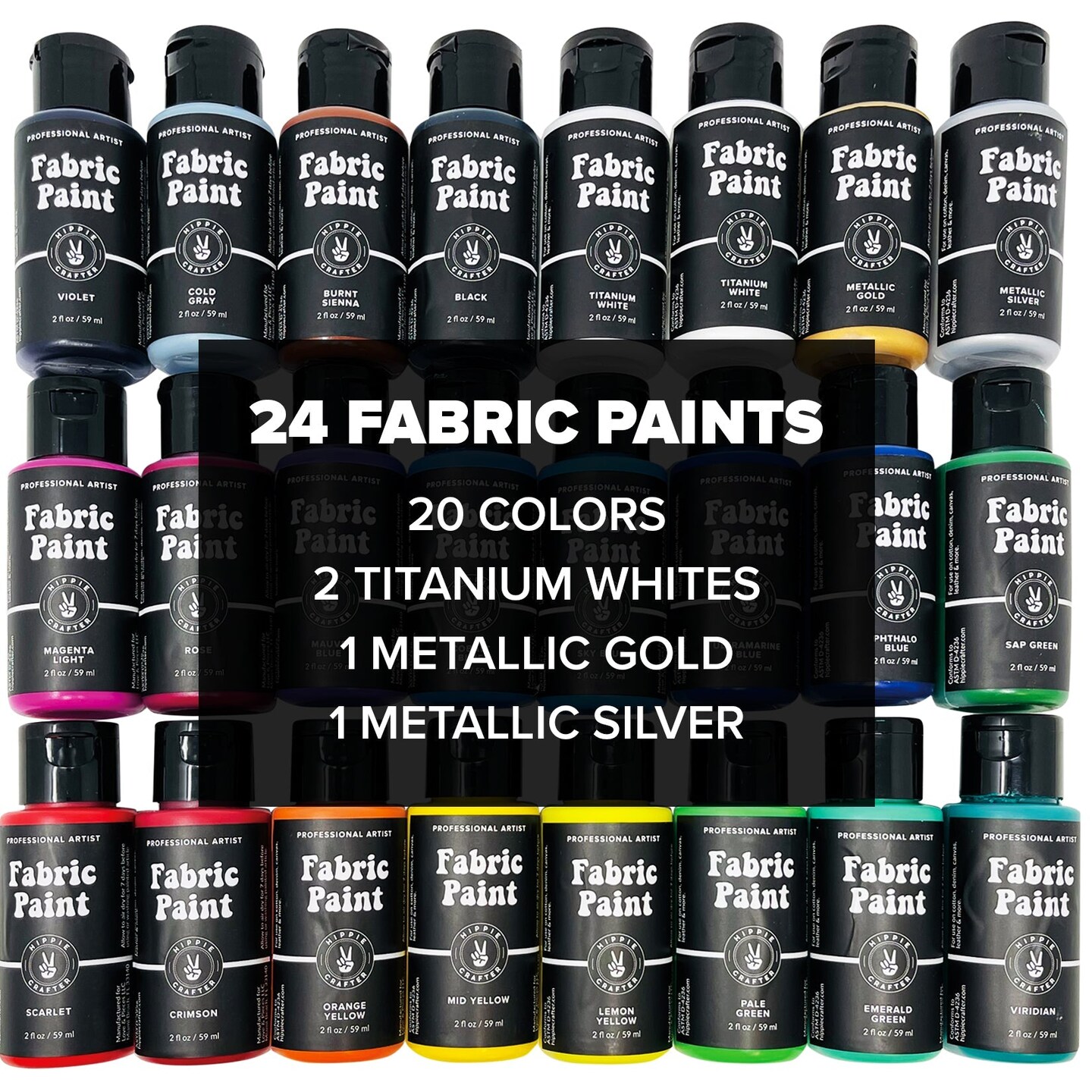 Permanent Fabric Paint for Clothes 24 Colors Bulk Kit for Upholstery Outdoor Cushions Shoe Paint Decorating Medium Acrylic Set Metallic Gold, White, Red, Yellow, Orange Pink
