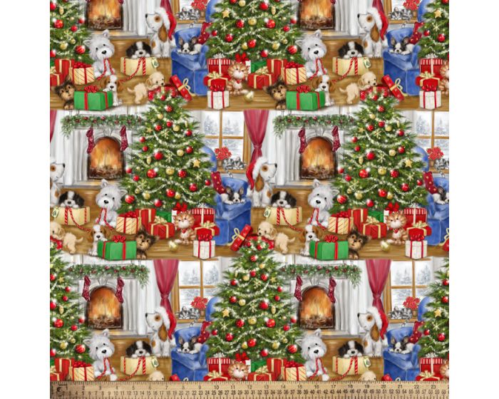 Pets On Christmas Morning Cotton Print Fabric | By the Yard | Sewing and Crafting | 44 inches wide
