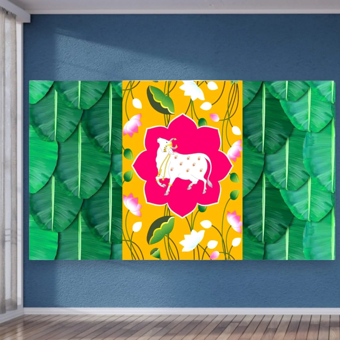 Pichwai Cow Print Backdrop 5x8 Feet Backdrop Indian Traditional Cloth Banana Leaf Decor Indian Pooja Wall Decor Indian Wall Art Photo Decor Banner Decorative Pooja Cloth Wedding Favor