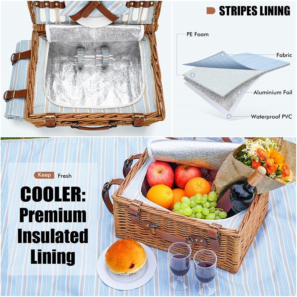 Picnic Basket Set for 2 Persons, Willow Hamper with Large Insulated Cooler Compartment, Waterproof Blanket and Cutlery Service Kit-Classical Brown