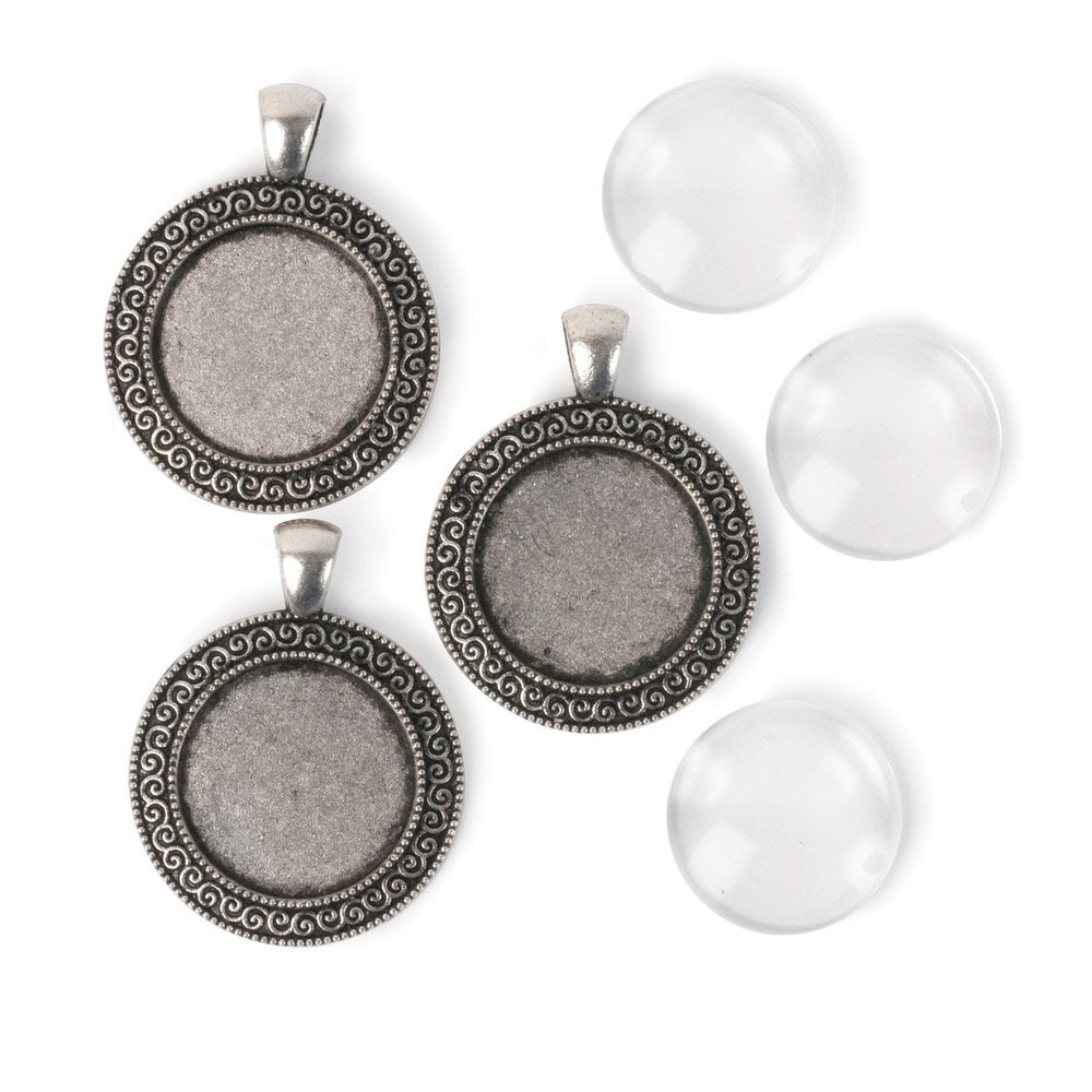 Picture Frame Pendants - Round with Decorative Frame, Antiqued Imitation Silver, for 22 mm Pictures - Set of Three