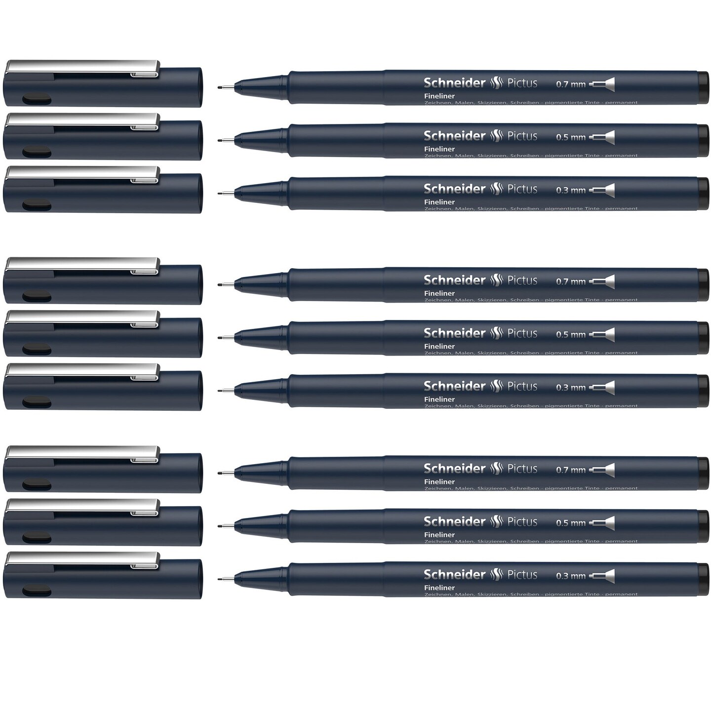 Pictus Fineliners, Wallet, Black Ink, Assorted Sizes, 3 Per Pack, 3 Packs