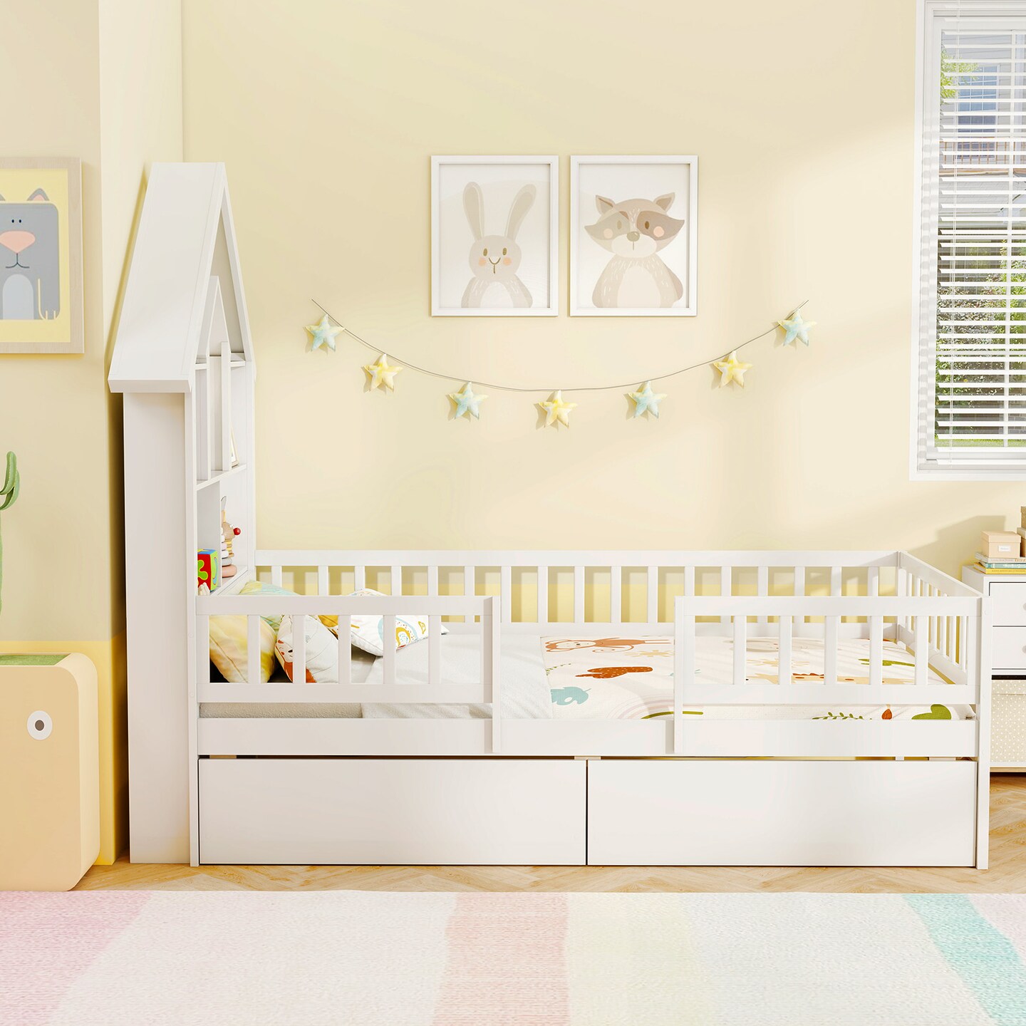 Pine Wood Twin Size Montessori Bed with Storage Drawers, Guardrails and House Design