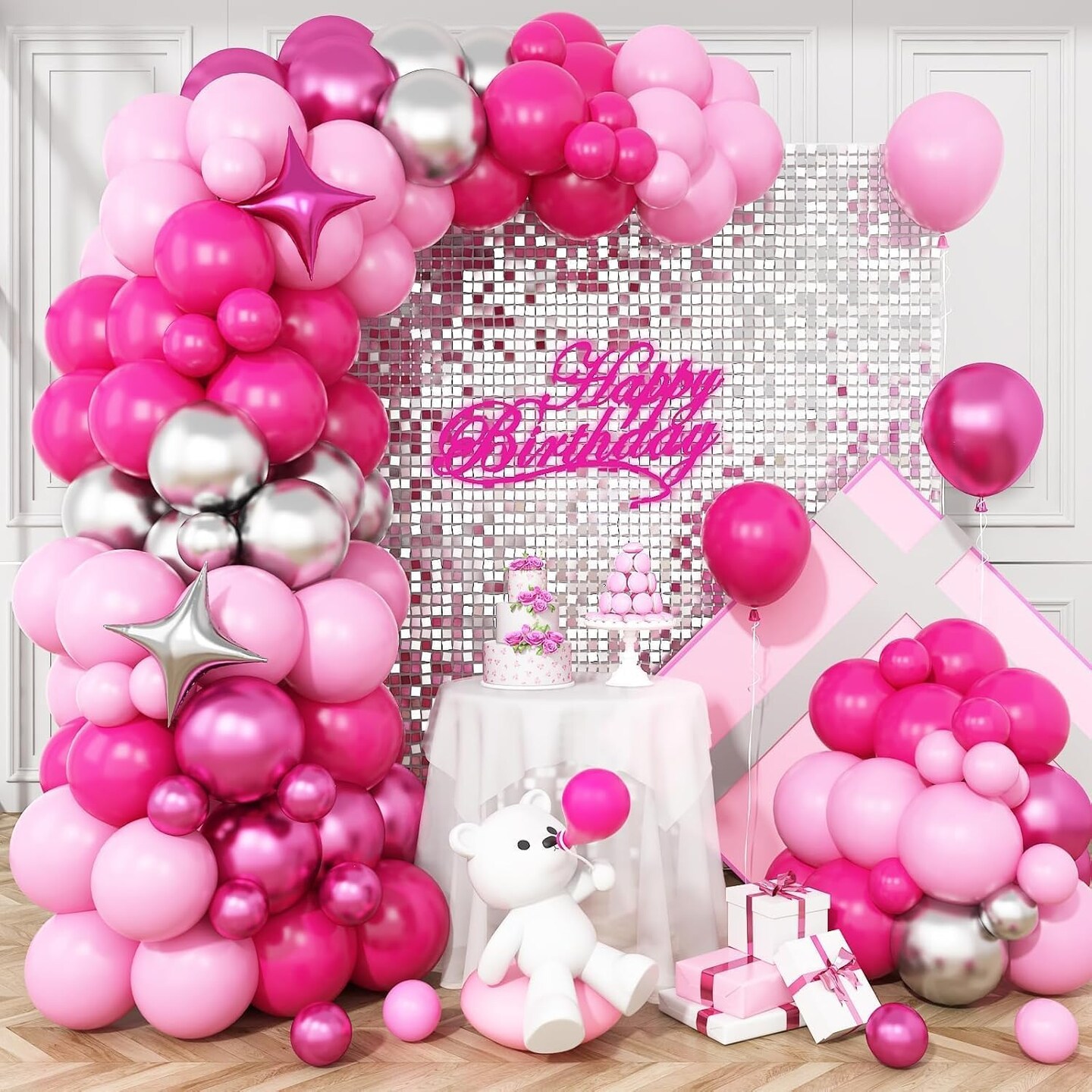 Pink and Silver Balloon Arch Kit (	Rose Red Pink)