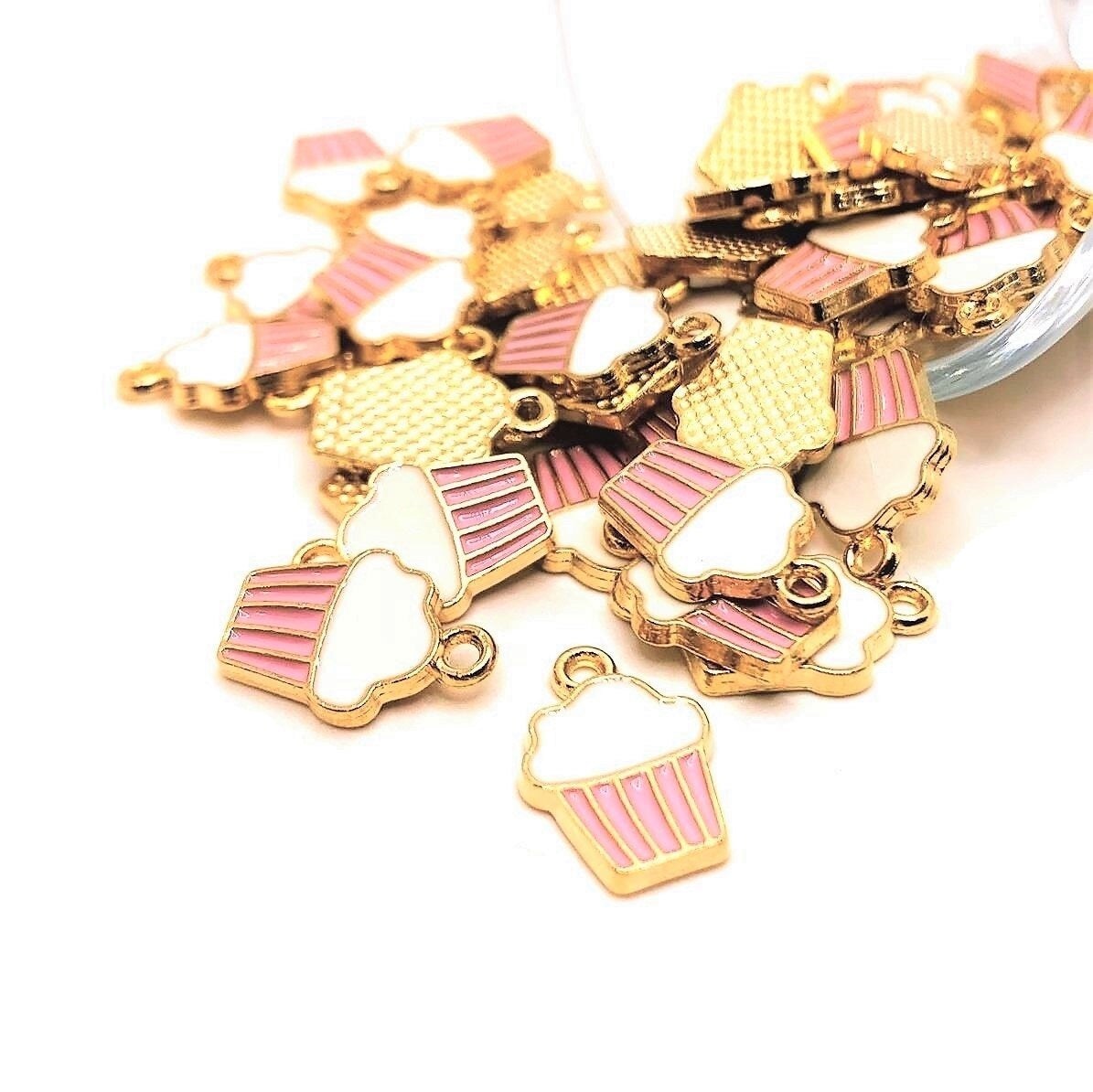Pink and White Enamel Cupcake Baker Charms, 16x11mm