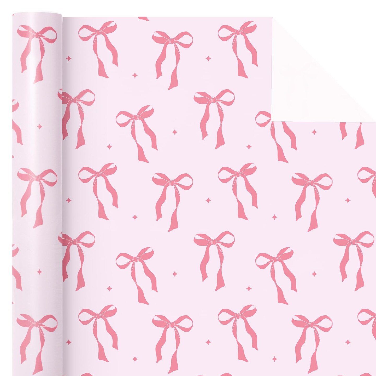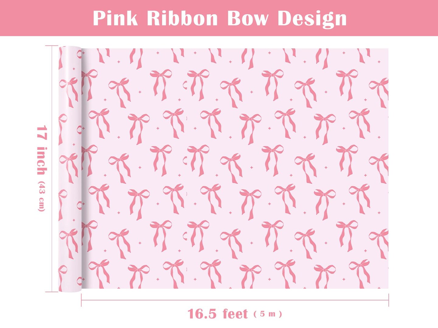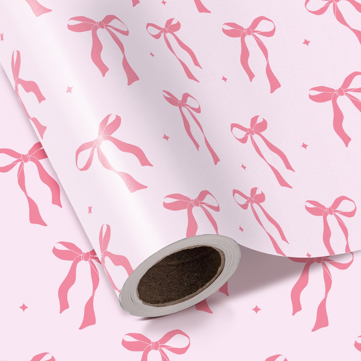 Pink Bow Wrapping Paper Roll - Mini Roll - 17 Inch x 16.5 Feet - Pink Ribbon Bow Design Perfect for Valentine's Day, Girls Birthday, Bachelorette Party, Baby Shower