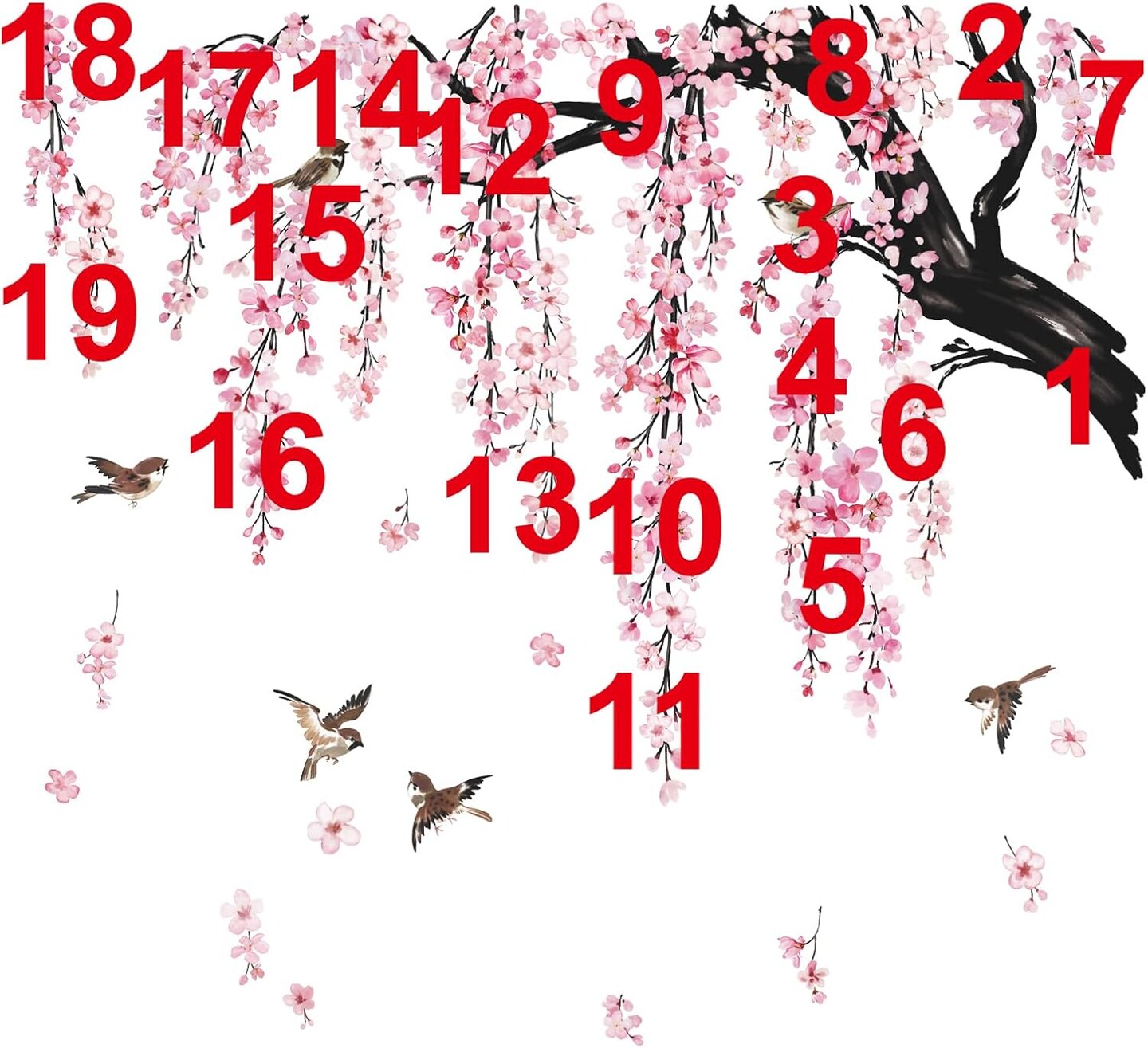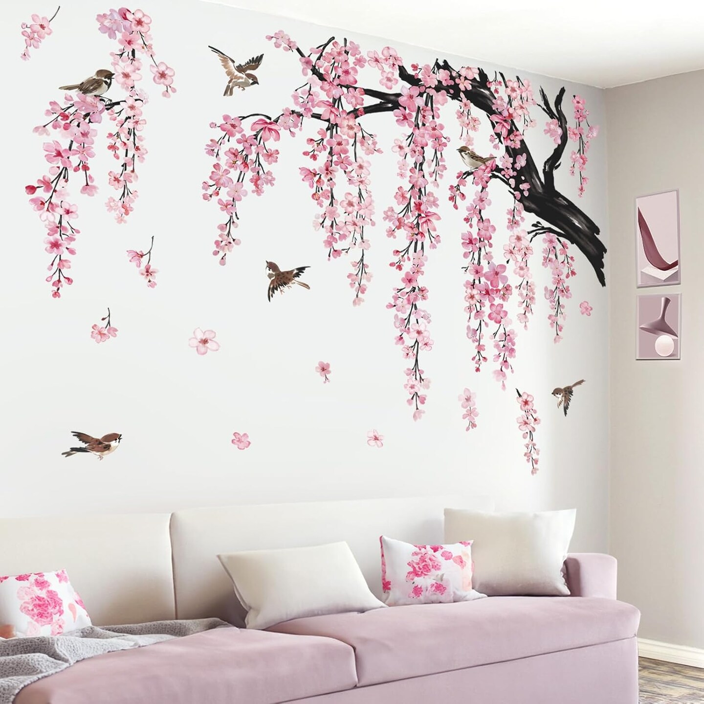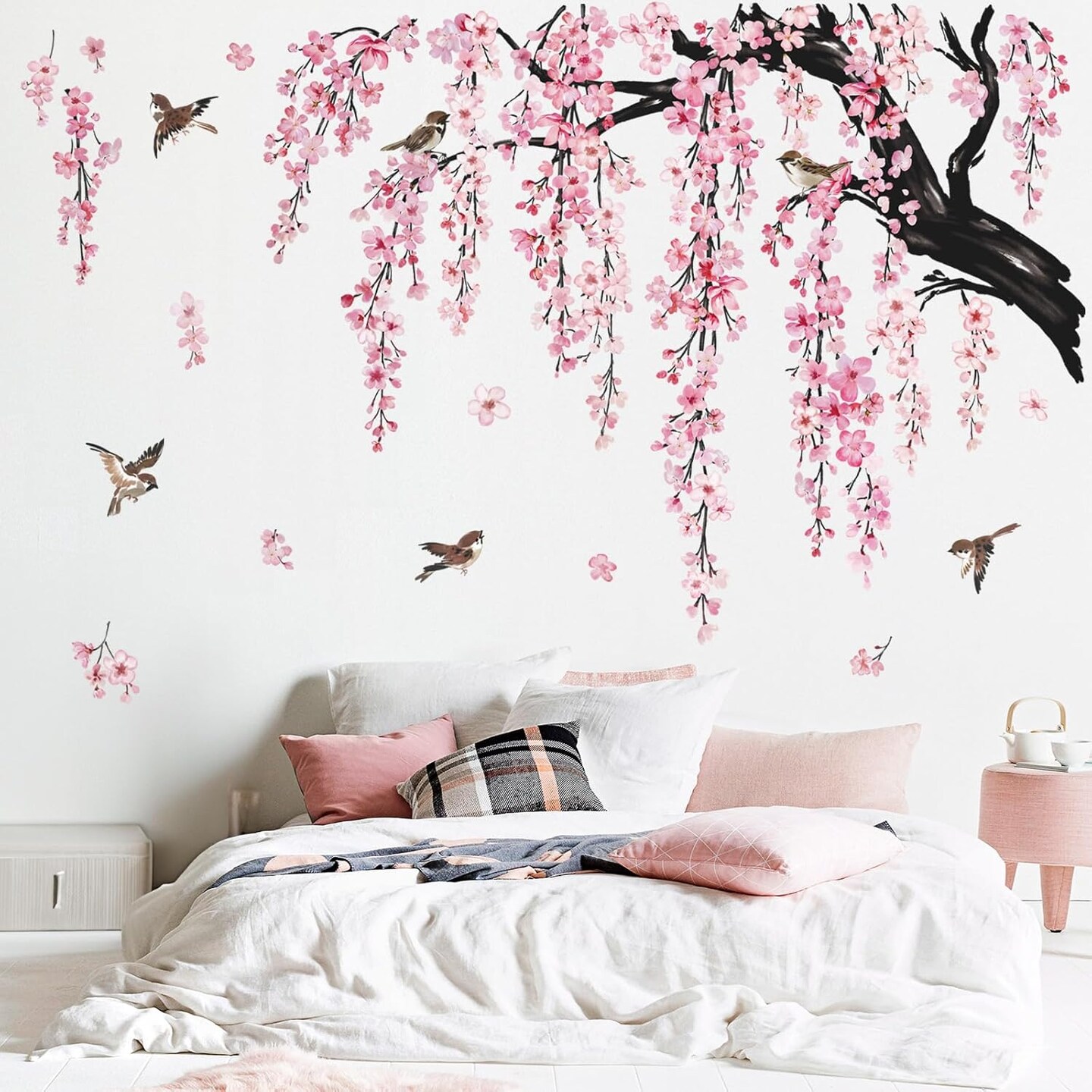Pink Cherry Blossom Floral Birds Wall Art Decals(Multi)