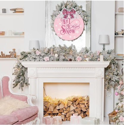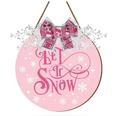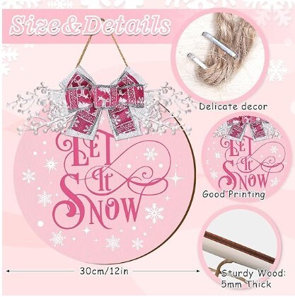 Pink Let It Snow Wooden Hanging Sign Xmas Winter Snowflake Door Wreath Decor with Bow Berries for Indoor Outdoor Home Farmhouse Porch Wall Window Decor Christmas Welcome Sign