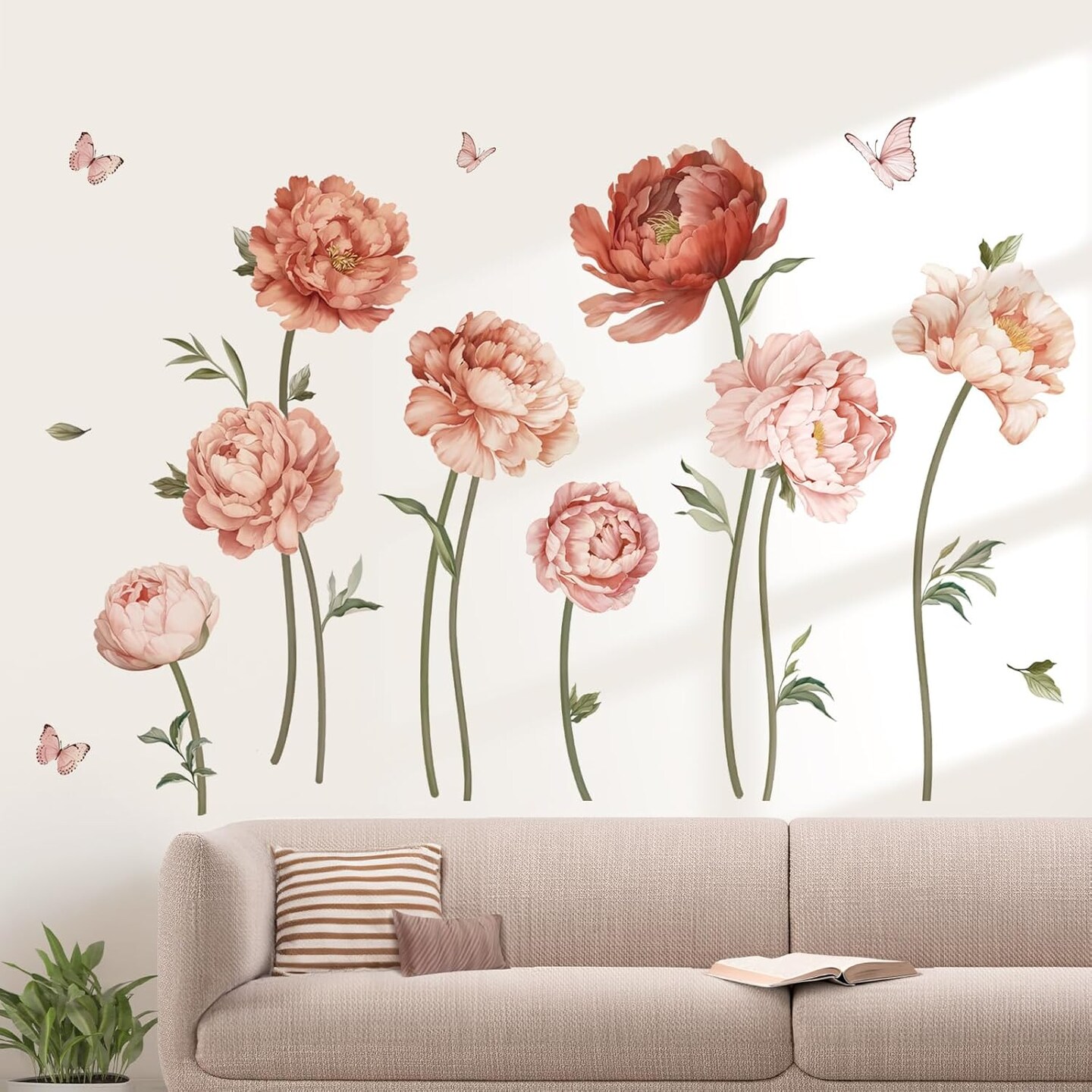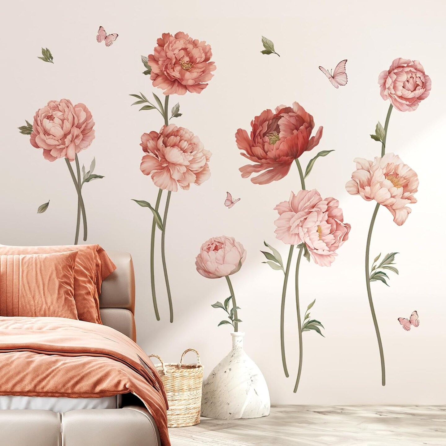 Pink Peony Rose Flower Wall Stickers Boho Floral Peel and Stick Wall Art Decals (Pink)