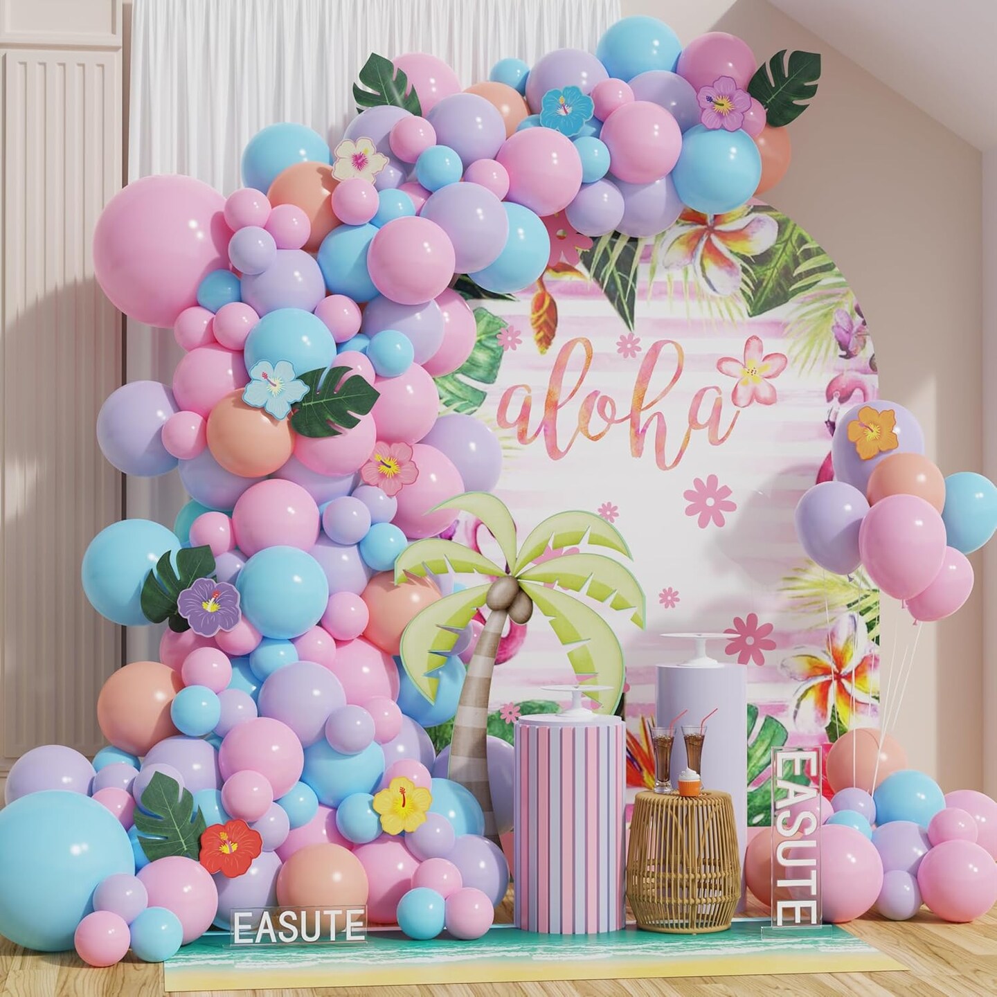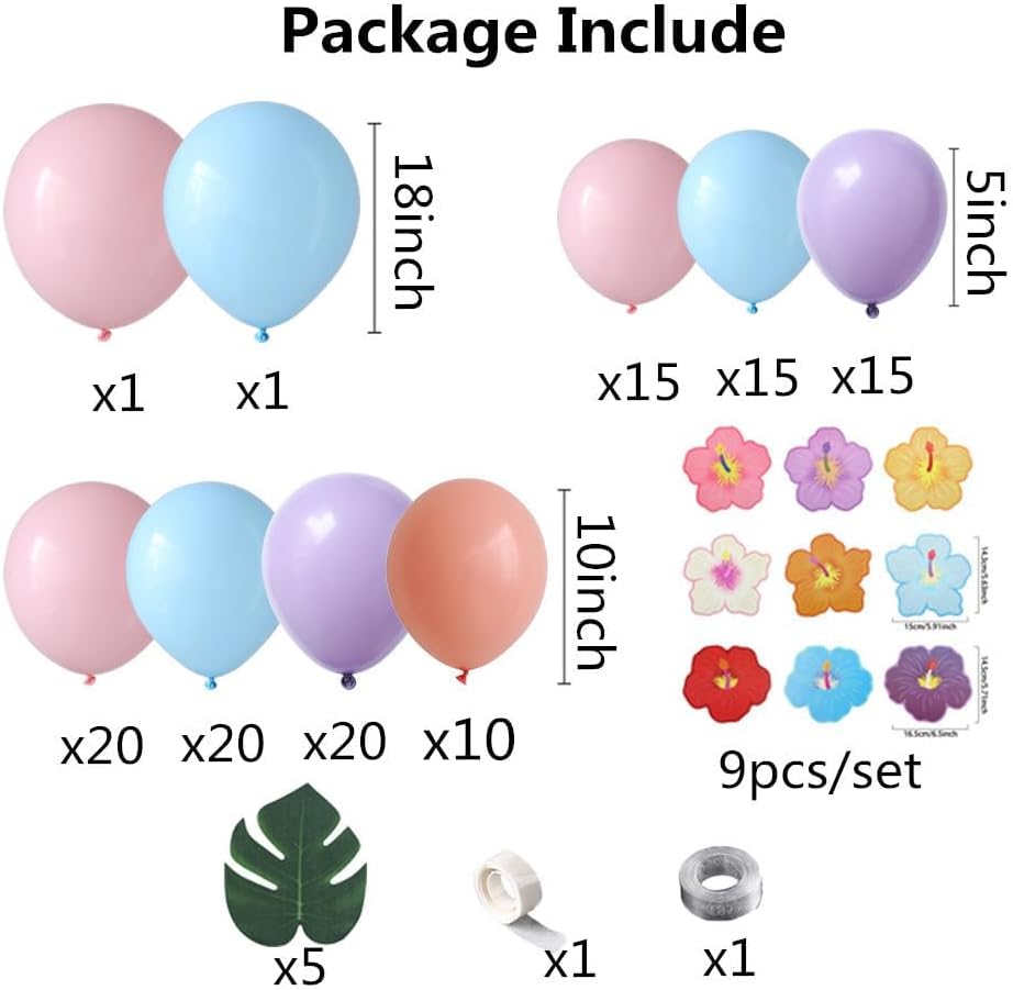 Pink Purple and Blue Balloon Garland Arch Kit with Summer Hibiscus Stickers for Tropical Hawaii Luau Party Supplies Aloha Luau Party Summer Baby Shower Birthday Decorations