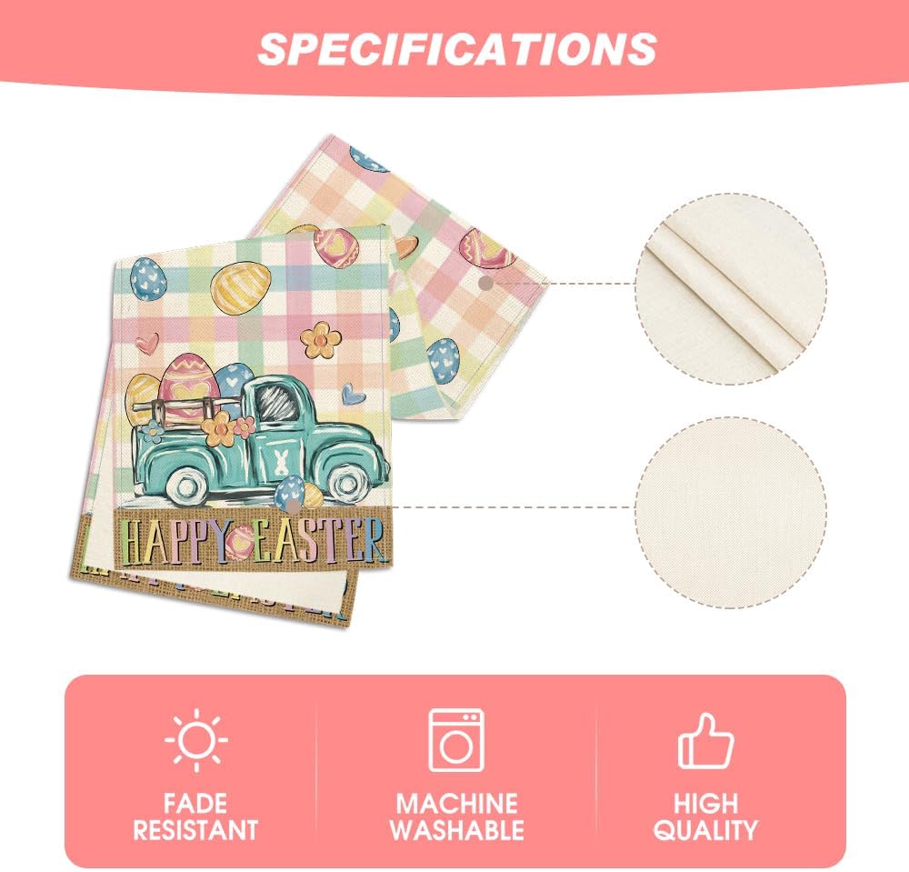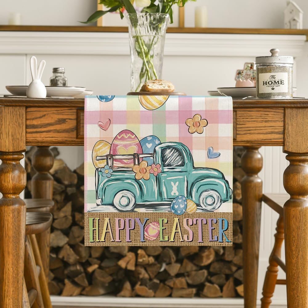 Pink Yellow Buffalo Plaid Carrot Egg Truck Daisy Happy Easter Table Runner, Seasonal Kitchen Dining Table Decoration for Indoor Home Party 13x72 Inch
