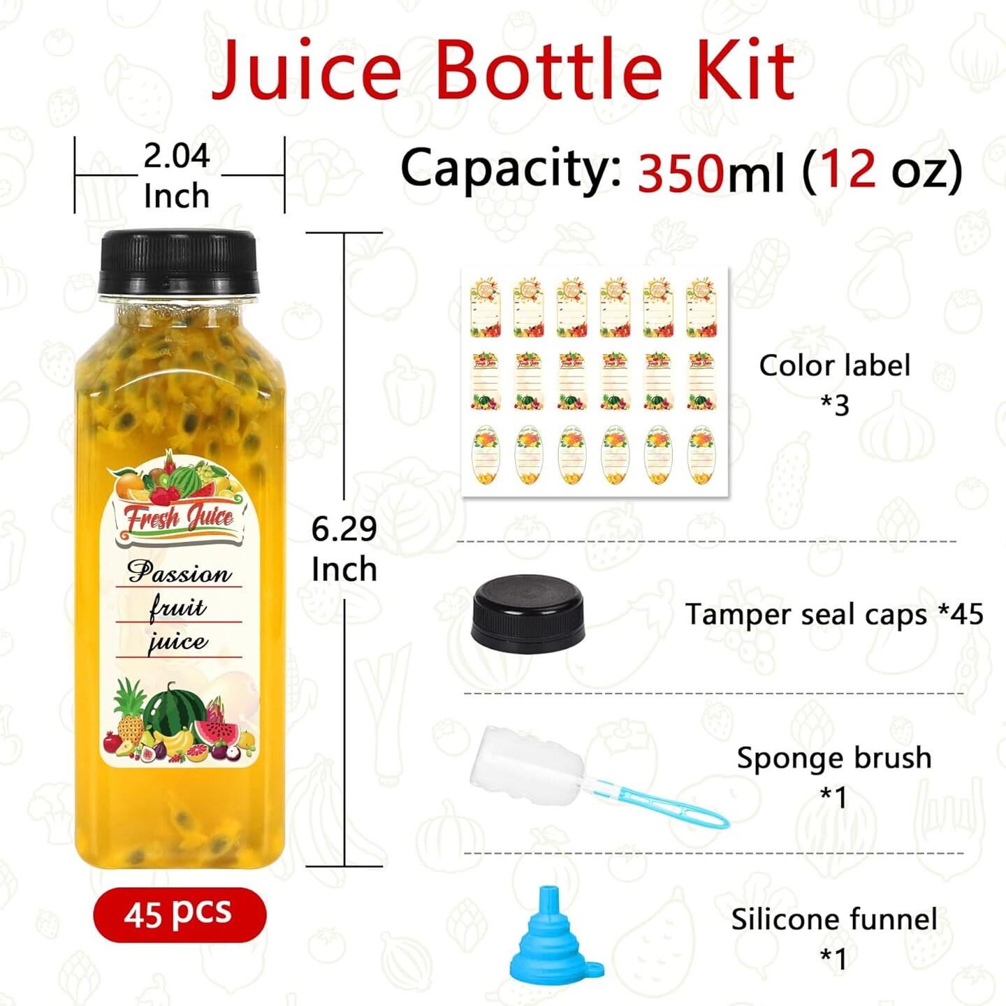 Plastic Juice Bottles with Caps 12 OZ, 45 Pcs (Transparent)