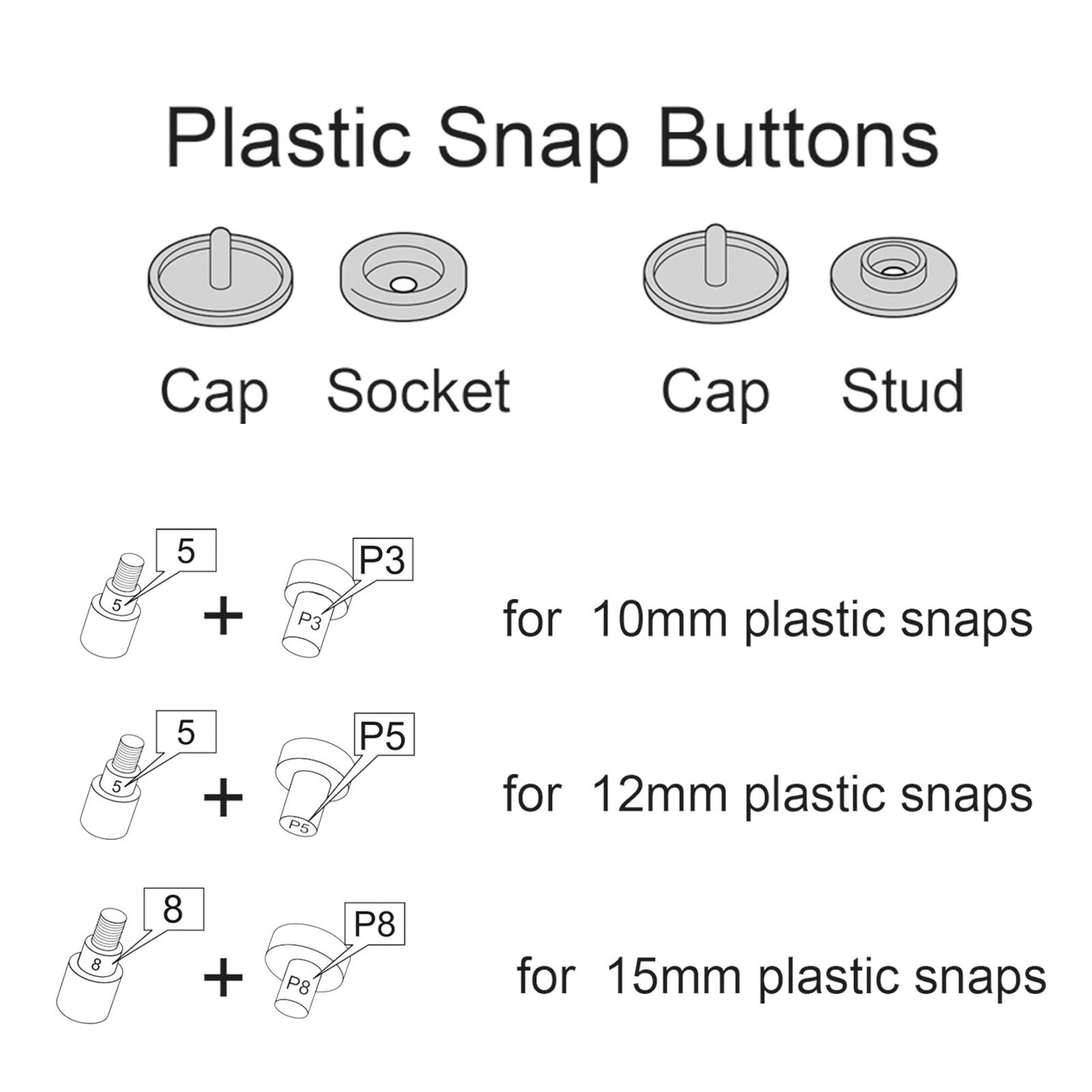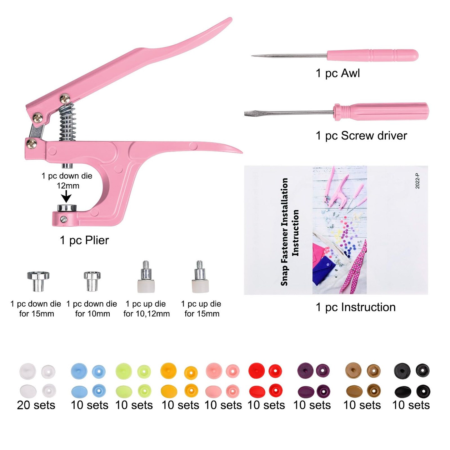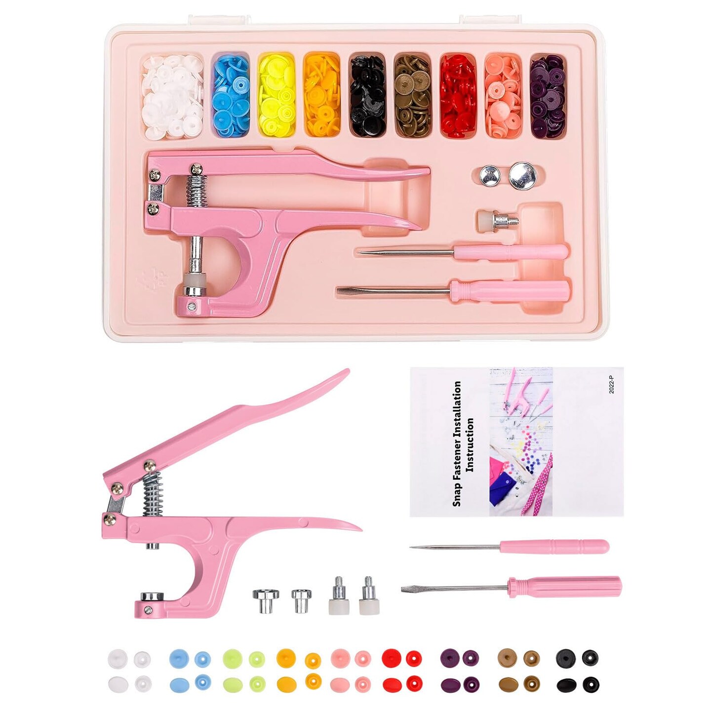 Plastic Snap Fastener Kit with Plier Screwdriver Awl and Storage Case, 100 Sets Snaps, 9 Colors T5 Buttons, 12mm Cap. Snap Plier for T3(10mm), T5(12mm), T8(15mm) Buttons, Pink